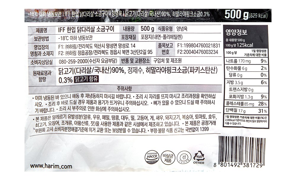 고소한 육즙과 짭짤한 소금 간이 잘 어우러진 닭다리살 소금구이예요. 신선한 상태의 닭고기를 개별 급속냉동하는 하림의 IFF 공법을 사용해, 촉촉하고 부드러운 육질이 돋보이지요. 먹기 편한 크기로 잘려있어 포크로 콕콕 찍어 드시기 좋답니다. 에어프라이어 조리가 가능하니, 간편하게 데워 먹음직스러운 닭다리살을 즐겨보세요.