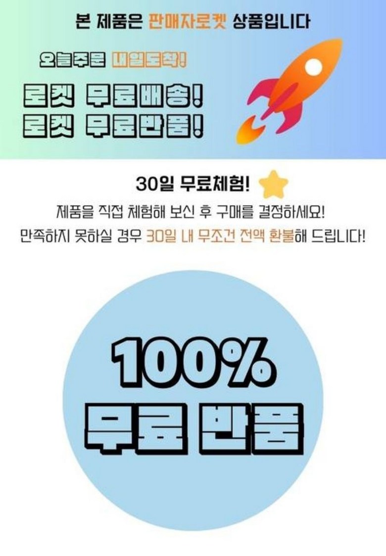 | 교환/반품 신청 기준일 | ㆍ단순변심에 의한 로켓배송 상품의 교환/반품은 제품 수령 후 30일 이내까지, 교환/반품 제한사항에 해당하지 않는 경우에만 가능 (교환/반품 비용 고객부담) ㆍ상품의 내용이 표시·광고의 내용과 다른 경우에는 상품을 수령한 날부터 3개월 이내, 그 사실을 안 날 또는 알 수 있었던 날부터 |