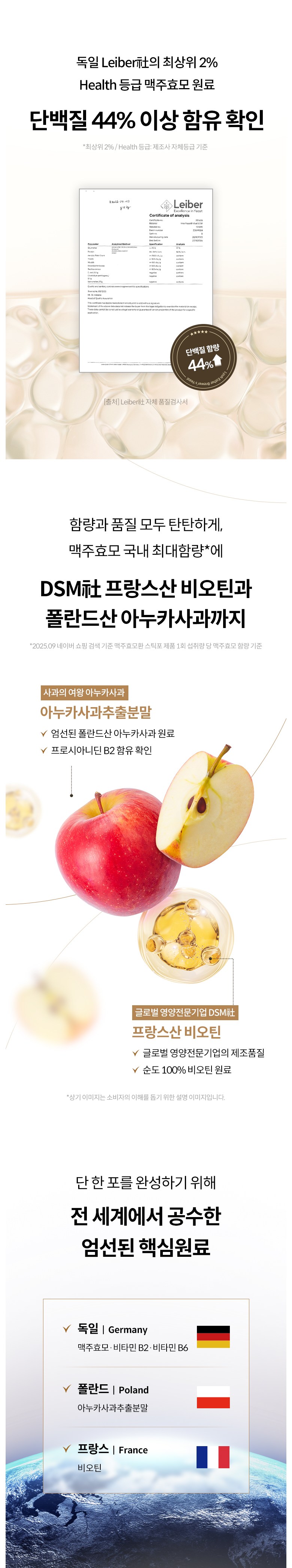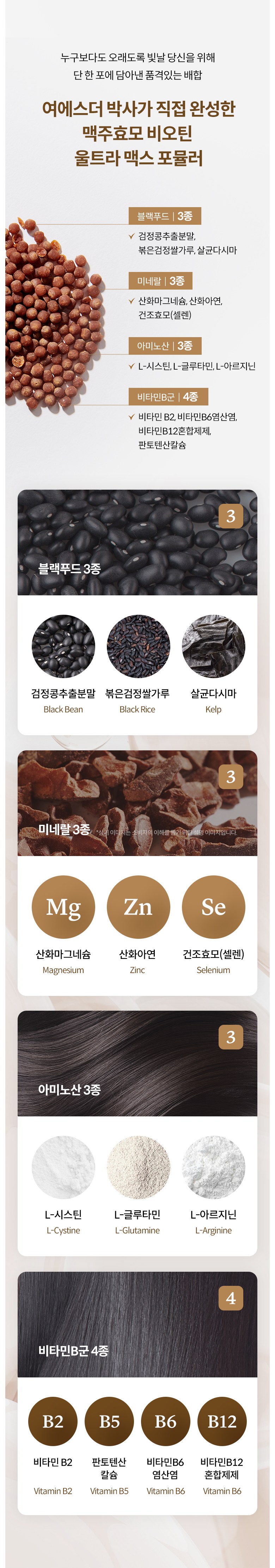 | 포장단위별 내용물의 용량(중량), 수량 | 1박스 당: 5.22 g * 14포(73.08 g) | 원재료명 및 함량 | 맥주효모(독일산), 검정콩추출분말[검정콩추출액(검정콩분말:국산)], 볶은검정쌀가루(검정쌀:국산), 아누카사과추출분말, 비오틴, 비타민B2, 판토텐산칼슘, 비타민B6염산염, 비타민B12혼합제제(말토덱스트린, 구연산삼나트륨, 구연산, 비타민B12), 살균다시마, 건조효모, 산화마그네슘, 산화아연, L-시스틴, L-아르지닌, L-글루타민 *알레르기주의 물질: 대두 함유 |