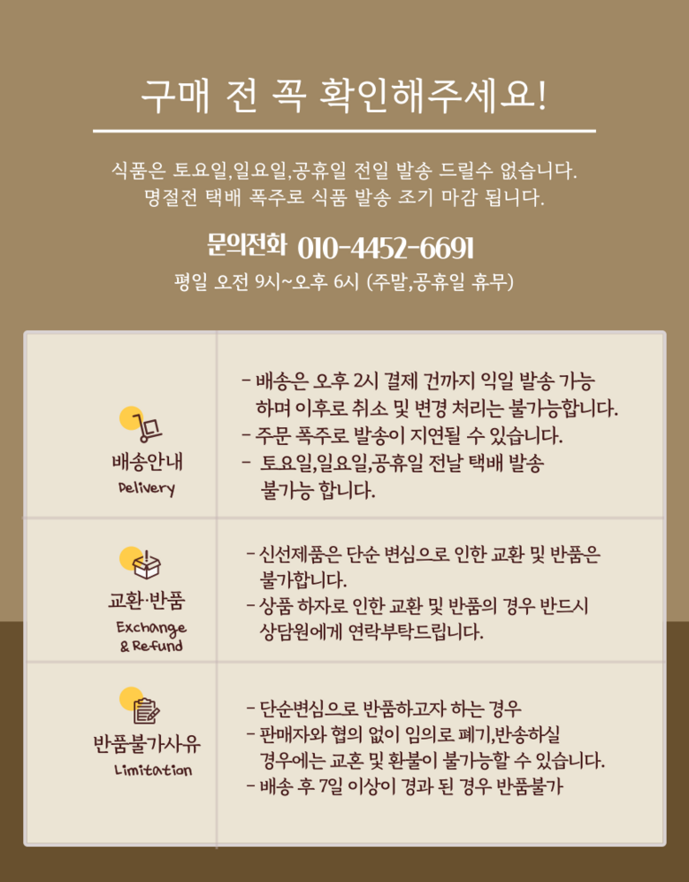 - ㆍ모니터 해상도의 차이로 인해 색상이나 이미지가 실제와 달라, 고객이 단순 변심으로 교환/반품을 무료로 요청하는 경우