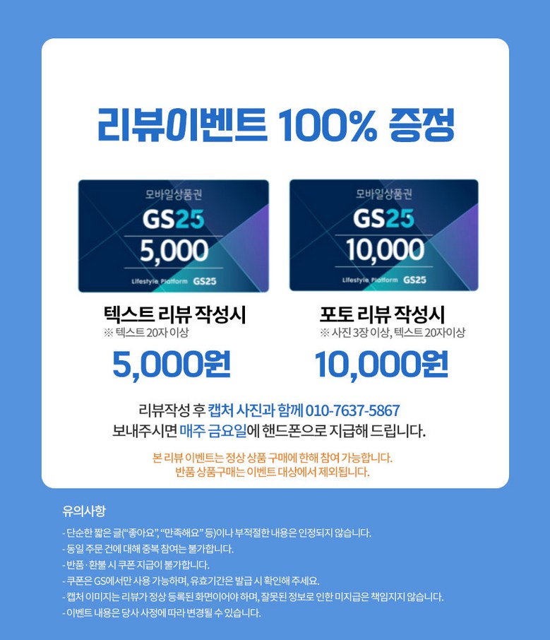 | 교환/반품 신청 기준일 | ㆍ단순변심에 의한 교환/반품은 제품 수령 후 7일 이내까지, 교환/반품 제한사항에 해당하지 않는 경우에만 가능 (배송비용과 교환/반품 비용 왕복배송비 고객부담) ㆍ상품의 내용이 표시·광고의 내용과 다른 경우에는 상품을 수령한 날부터 3개월 이내, 그 사실을 안 날 또는 알 수 있었던 날부터 |