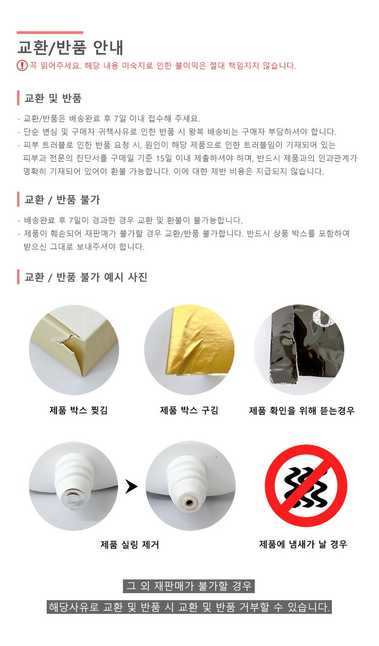 | 교환/반품 신청 기준일 | ㆍ단순변심에 의한 교환/반품은 제품 수령 후 7일 이내까지, 교환/반품 제한사항에 해당하지 않는 경우에만 가능 (배송비용과 교환/반품 비용 왕복배송비 고객부담) ㆍ상품의 내용이 표시·광고의 내용과 다른 경우에는 상품을 수령한 날부터 3개월 이내, 그 사실을 안 날 또는 알 수 있었던 날부터 |
