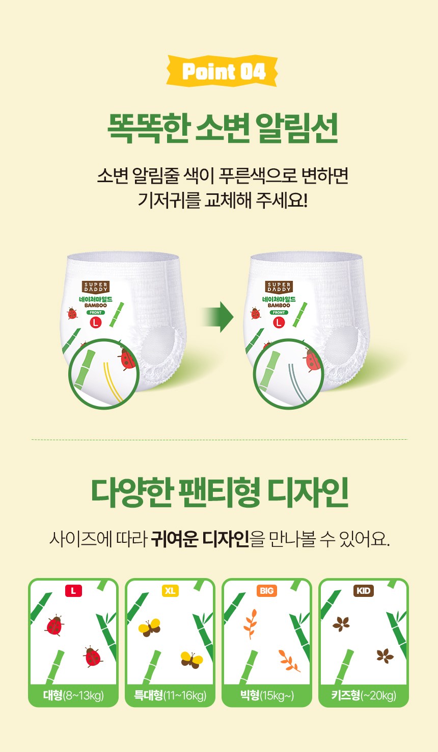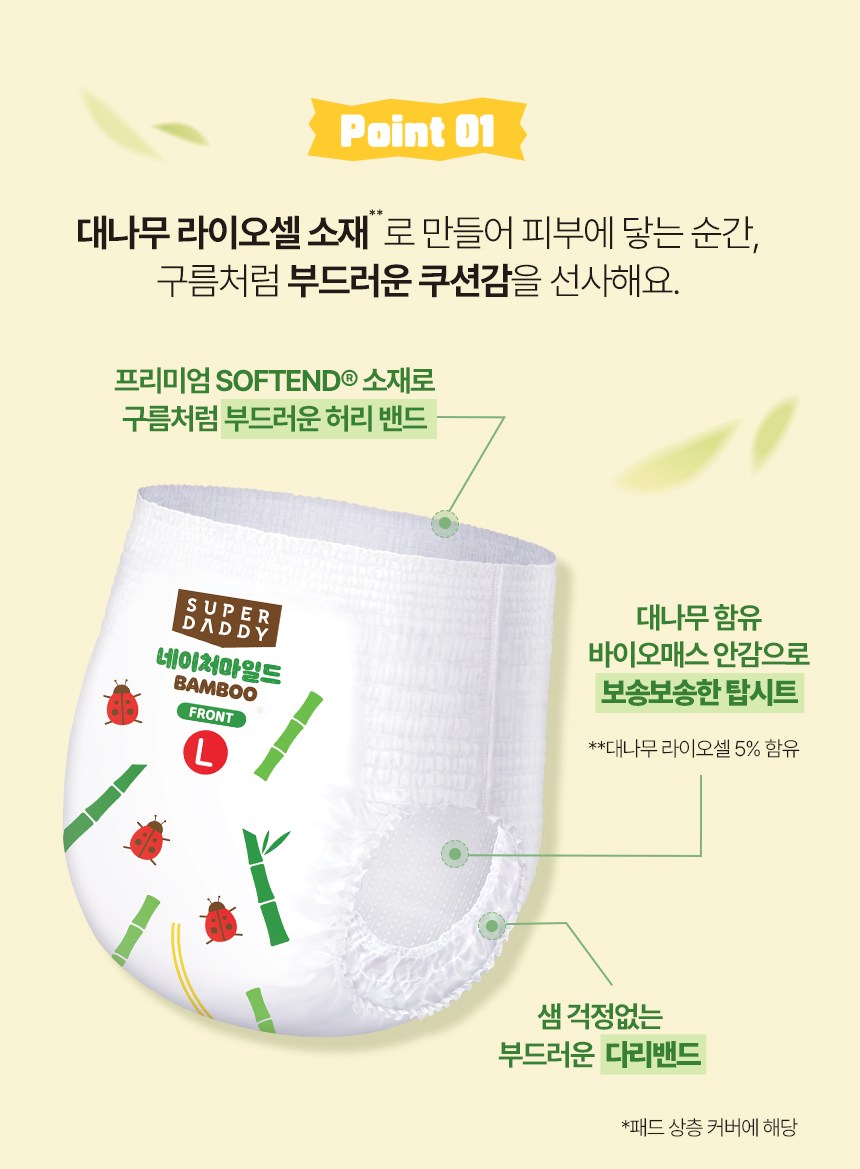 | 품명 및 모델명 | 슈퍼대디 네이처마일드 밤부 팬티 특대형 | 인증/허가 사항 | 위생용품 |