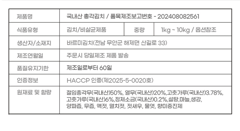 | 품목 또는 명칭 | [매일 10개 한정 수량] 노마진 국내산 총각김치 | 포장단위별 내용물의 용량(중량),수량,크기 | 1kg,2kg,3kg,5kg,10kg |