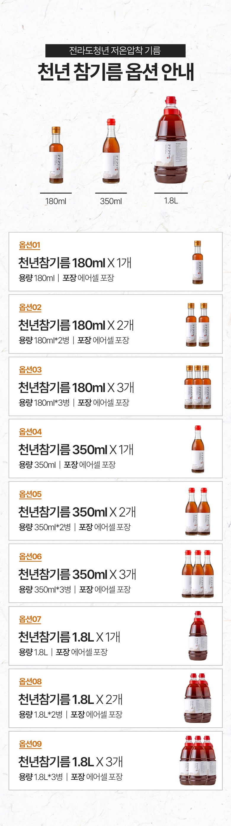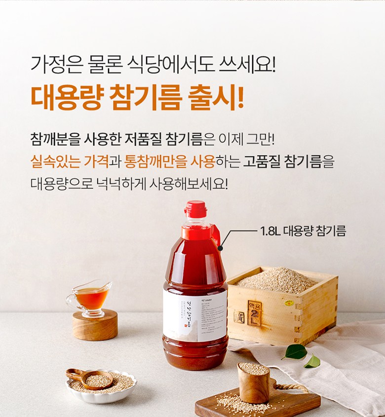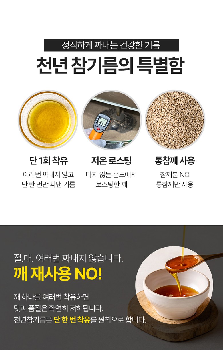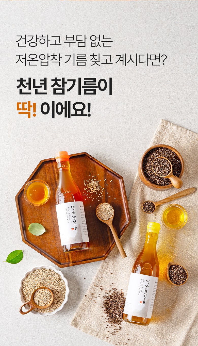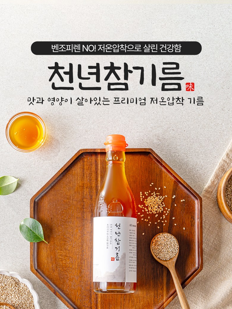 | 품목 또는 명칭 | 천년참기름 | 포장단위별 내용물의 용량(중량),수량,크기 | 180ml,350ml,1800ml |