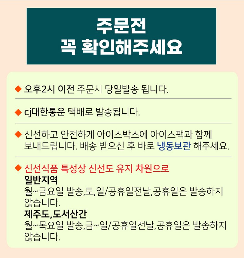| 배송방법 | 신선/냉장/냉동 | 배송비 | 무료배송 · 도서산간 추가 배송비 - 제주 지역: 4,000원 - 도서산간 지역: 5,000원 |