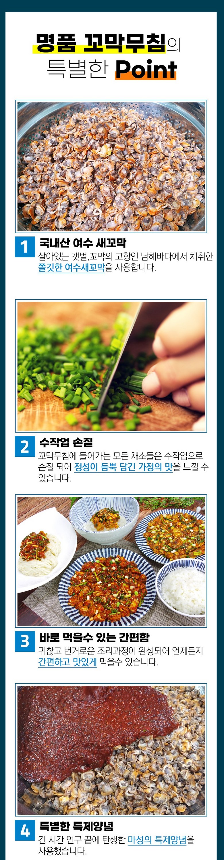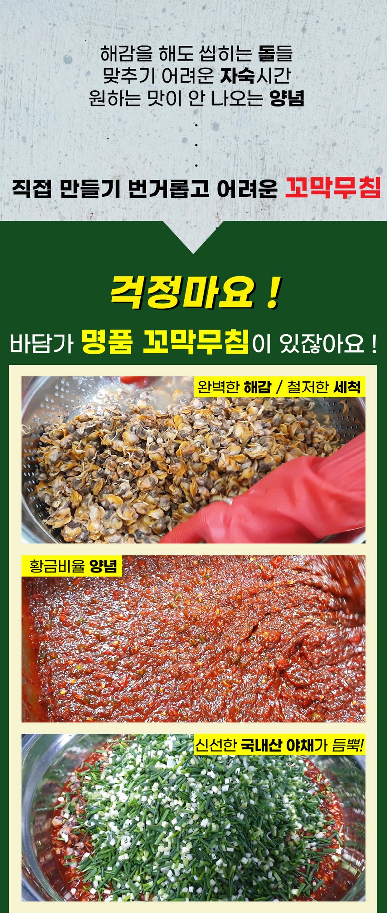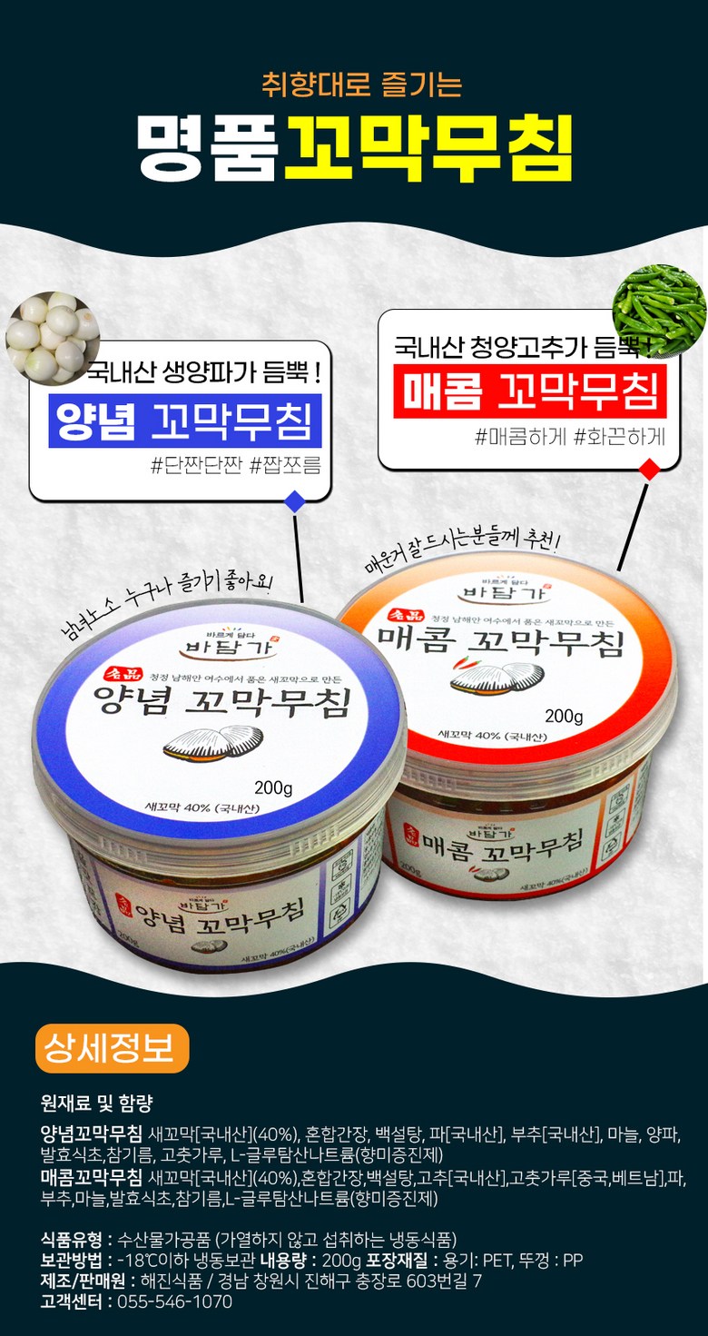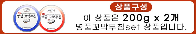 | 포장단위별 내용물의 용량(중량), 수량 | 200g,2통 | 원재료명 및 함량 | 양념꼬막무침새꼬막[국내산](40%), 혼합간장, 백설탕, 파[국내산], 부추[국내산], 마늘, 양파,발효식초, 참기름, 고춧가루, L-글루탐산나트륨(향미증진제) 매콤꼬막무침새꼬막[국내산](40%), 혼합간장, 백설탕,고추[국내산],고춧가루[중국,베트남],파,부추,마늘,발효식초,참기름,L-글루탐산나트륨(향미증진제) |