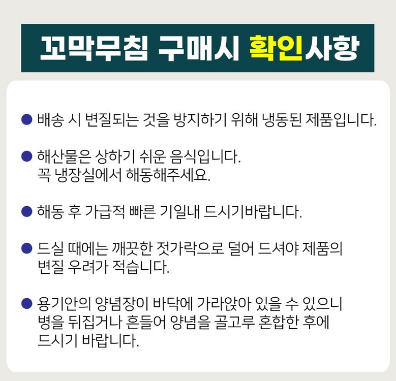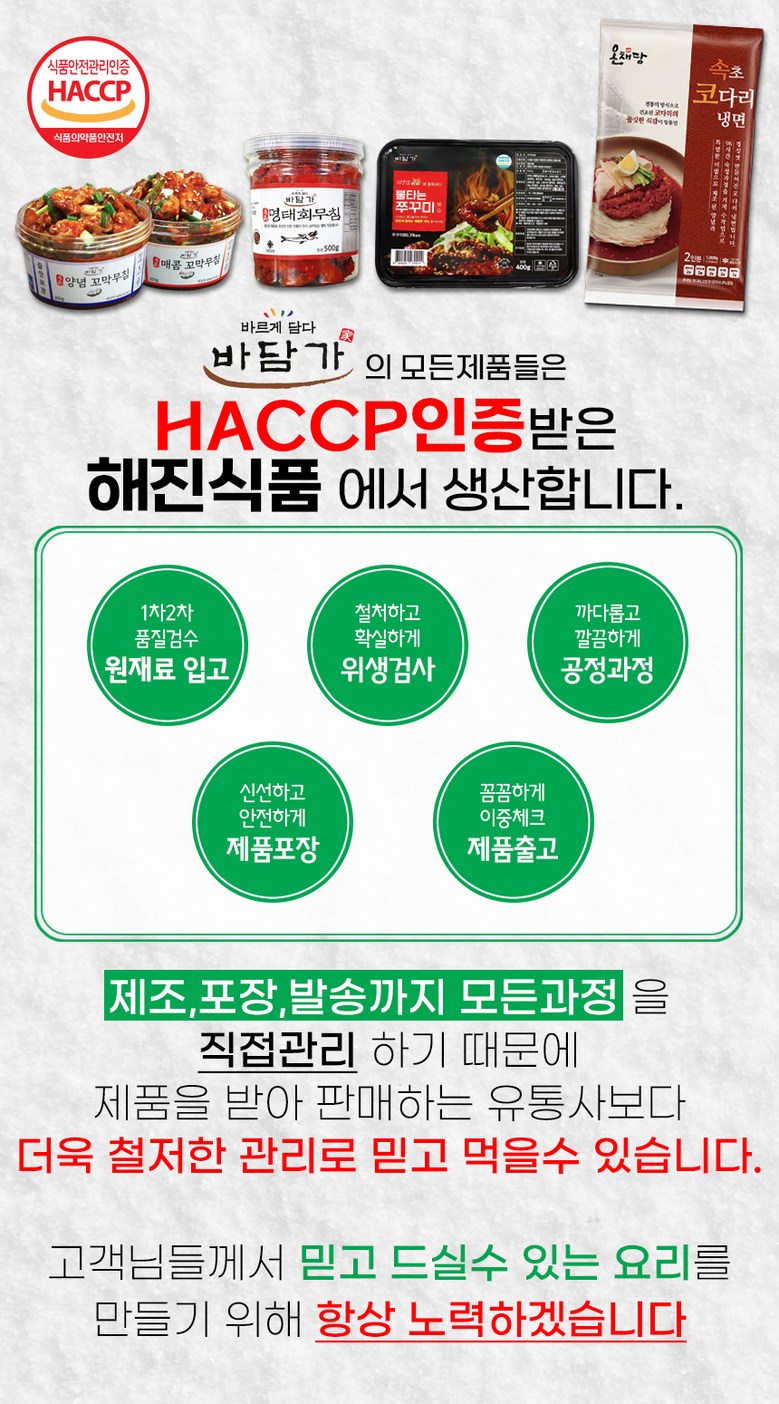 | 생산자 및 소재지 | 해진식품 / 경남 창원시 진해구 충장로 603번길 7 | 제조연월일, 소비기한 또는 품질유지기한 | 상품상세참조 |