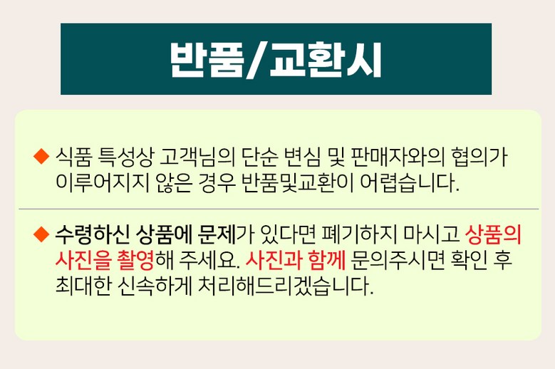 - 식품 특성상 고객님의 단순 변심,일자 및 주문착오, 불만족 등의 이유로 판매자와의 협의가 이루어지지 않은 경우 반품 및 교환이 어렵습니다.