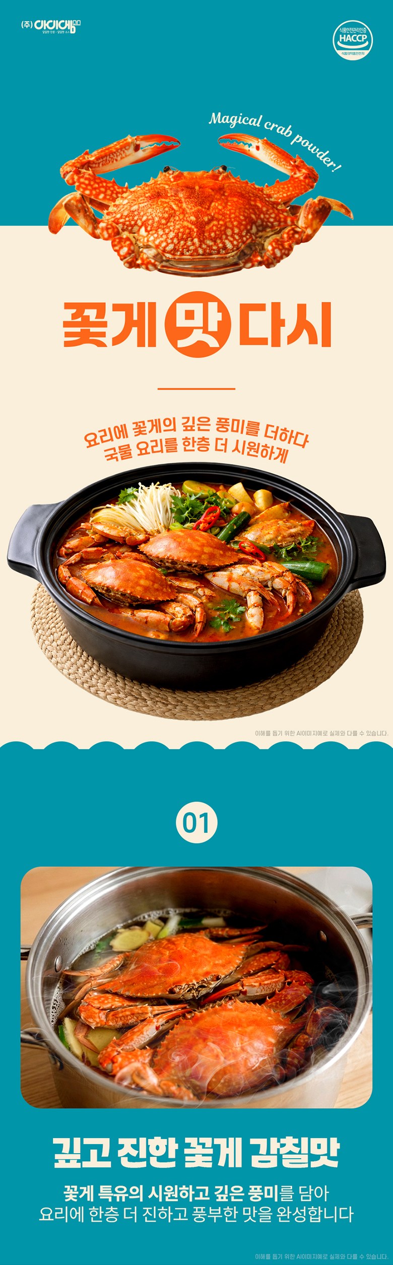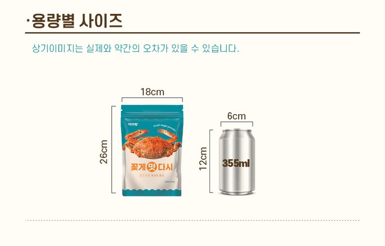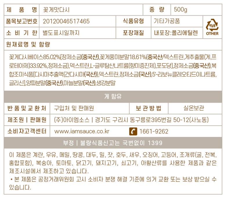 | 포장단위별 내용물의 용량(중량), 수량 | 500g | 원재료명 및 함량 | 꽃게다시베이스85.02%[정제소금(중국산),꽃게풍미분말18.61%{중국산/덱스트린,게추출물(게,프로테아제)33.92%,정제소금},덱스트린,L-글루탐산나트륨(향미증진제),포도당],정제소금(중국산),복합조미식품[다시마추출액{건다시마(국산)},덱스트린,정제소금(국산),5'-리보뉴클레오티드이나트륨,글리신],양파분말(중국산),마늘분말(국산),생강분말 |