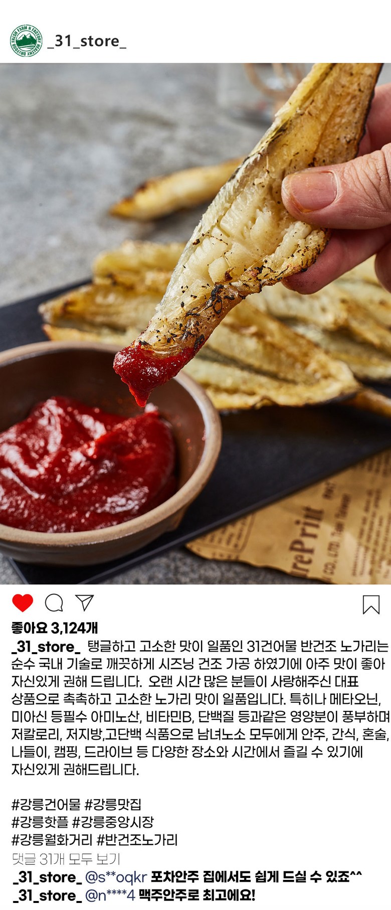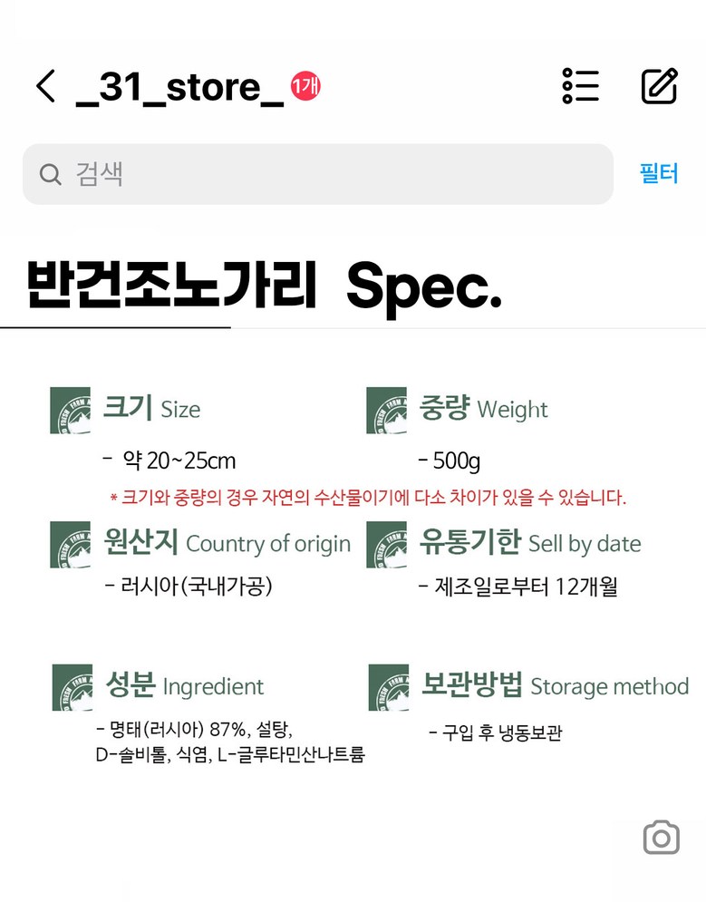 | 제품명 | 31건어물 반건조 노가리 | 식품의 유형 | 조미건어포류 |