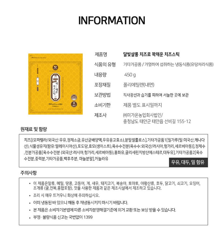 | 포장단위별 내용물의 용량(중량), 수량 | 상품 상세페이지 참조 | 원재료명 및 함량 | 원재료명: 「농수산물의 원산지 표시 등에 관한 법률」에 따른 원산지 표시 포함함량: 원재료 함량 표시대상 식품에 한함 |
