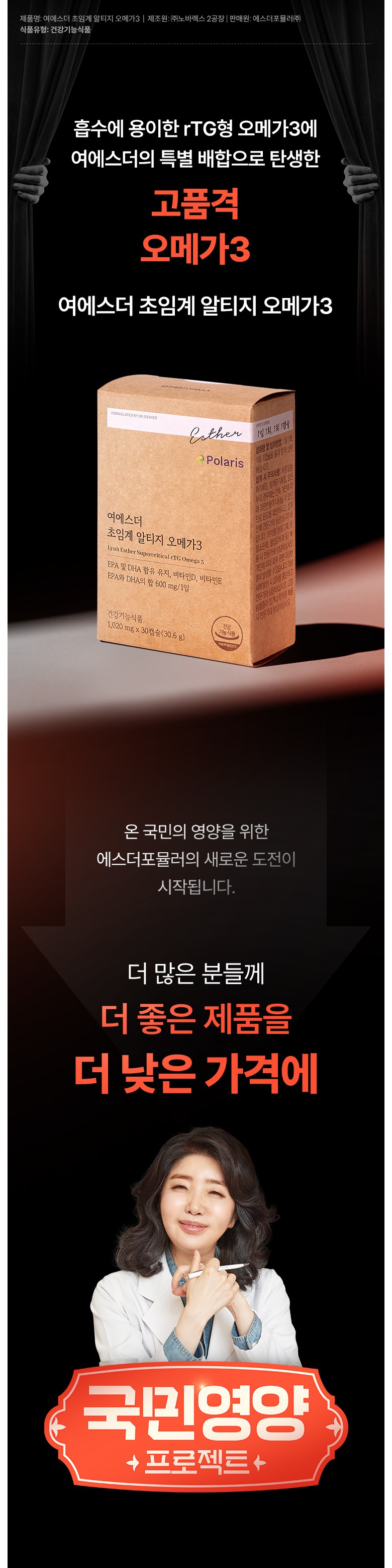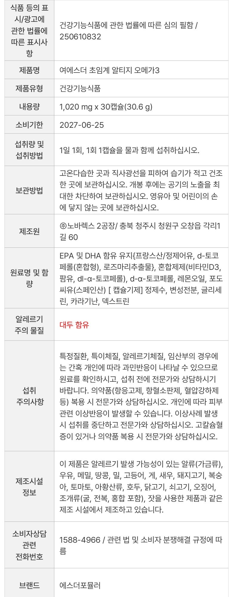 | 제품명 | 여에스더 초임계 알티지 오메가3 (건강기능식품에 관한 법률에 따른 심의 필함 / 250610832) | 제조업소의 명칭과 소재지 | ㈜노바렉스 2공장/ 충북 청주시 청원구 오창읍 각리1길 60 |