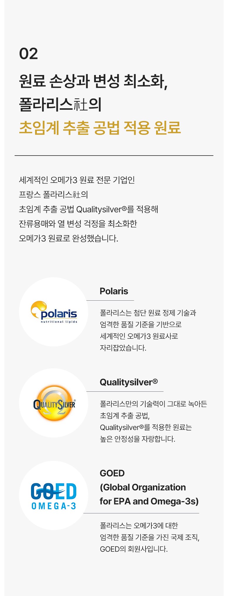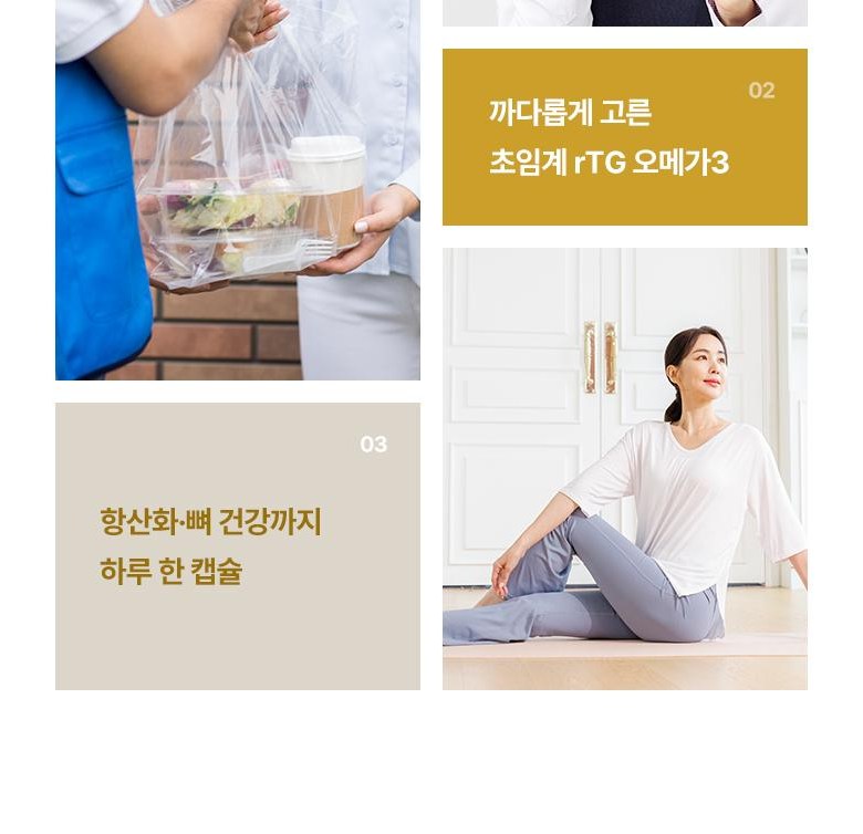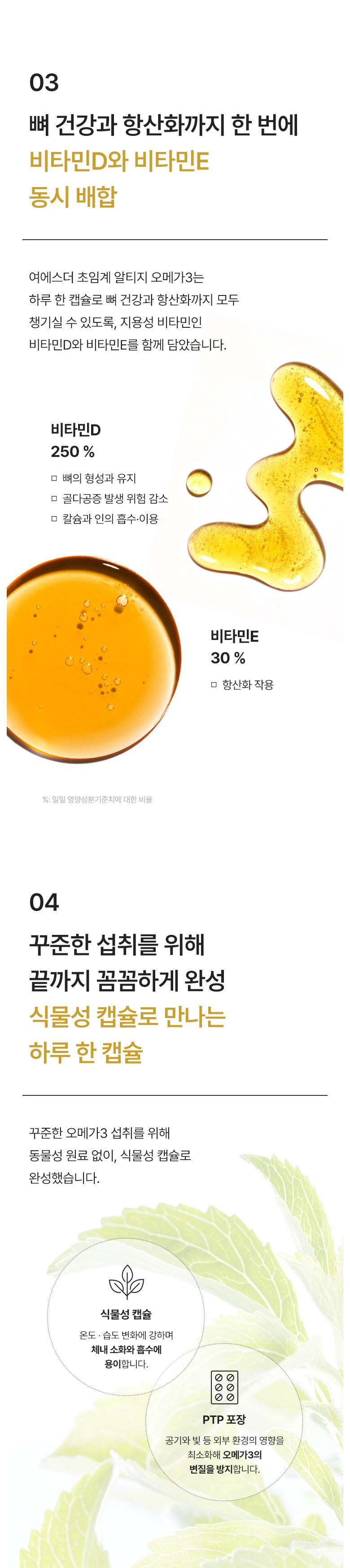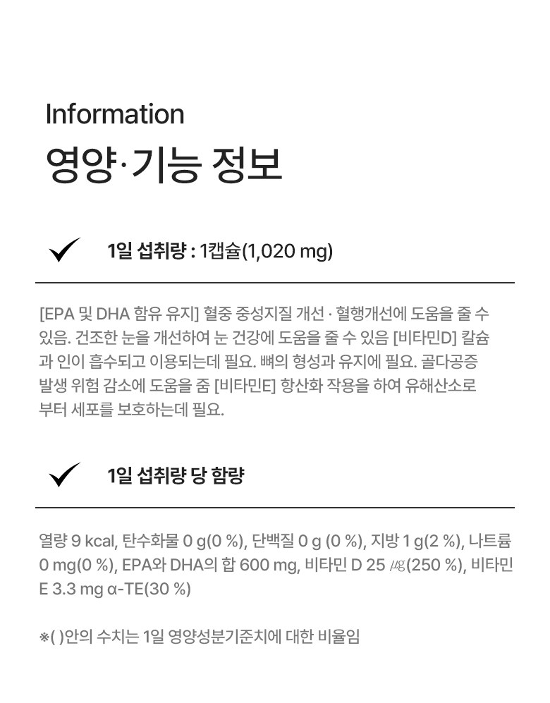 | 원료명 및 함량 | EPA 및 DHA 함유 유지{프랑스산/정제어유, d-토코페롤(혼합형), 로즈마리추출물}, 혼합제제(비타민D3, 팜유, dl-α-토코페롤), d-α-토코페롤, 레몬오일, 포도씨유(스페인산) [ 캡슐기제] 정제수, 변성전분, 글리세린, 카라기난, 덱스트린 *알레르기 주의물질: 대두 함유 | 영양정보 | 상품 상세페이지 참조 |