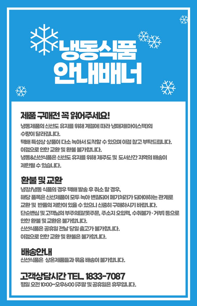 | 배송방법 | 신선/냉장/냉동 | 배송비 | 무료배송 - 도서산간 지역 배송불가 |