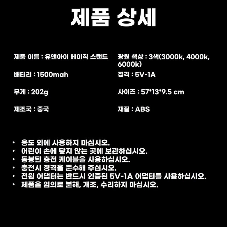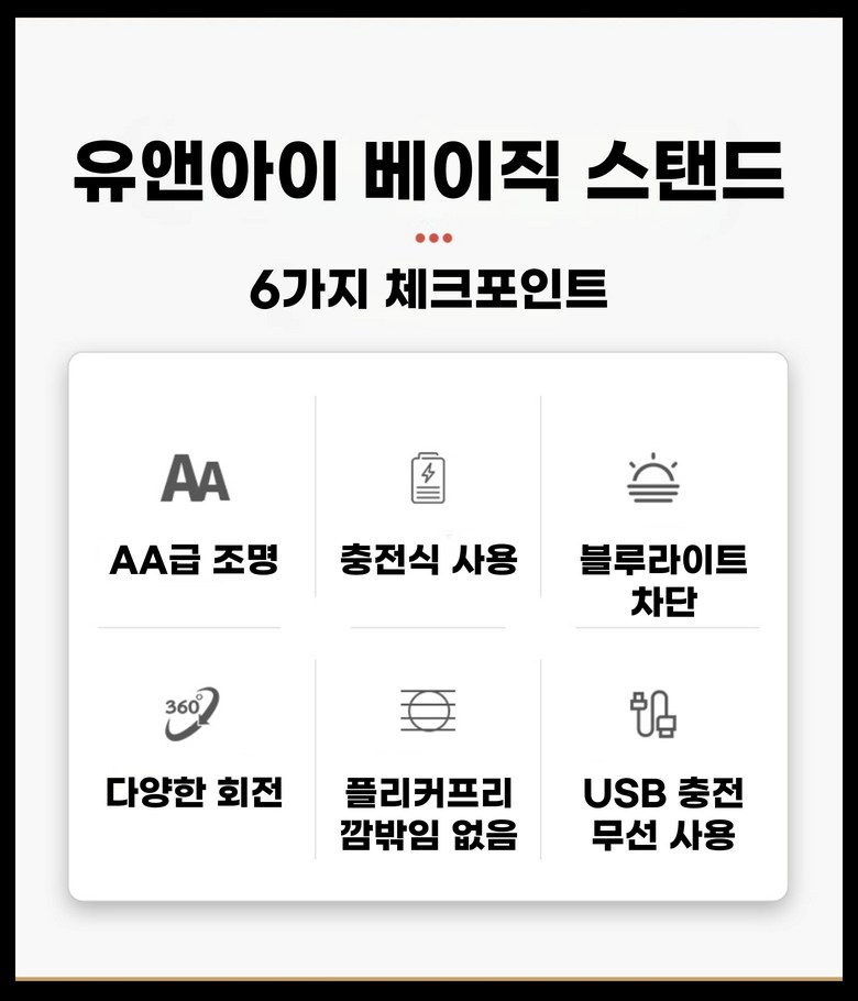 | 품명 및 모델명 | 유앤아이 블루라이트차단 플리커프리 무선 충전식 LED 스탠드 | KC 인증정보 | 해당없음 |