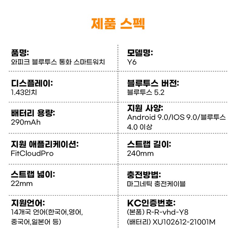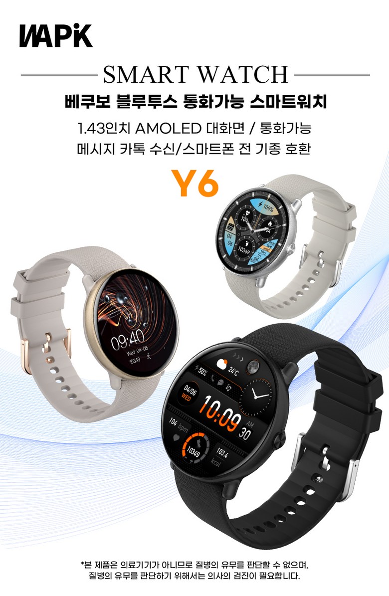 | 품명 및 모델명 | WAPIK 통화가능 스마트워치 Y6 1.43인치 AMOLED 대화면 한글지원 | KC 인증정보 | XU102612-21001M, R-R-vhd-Y8 |