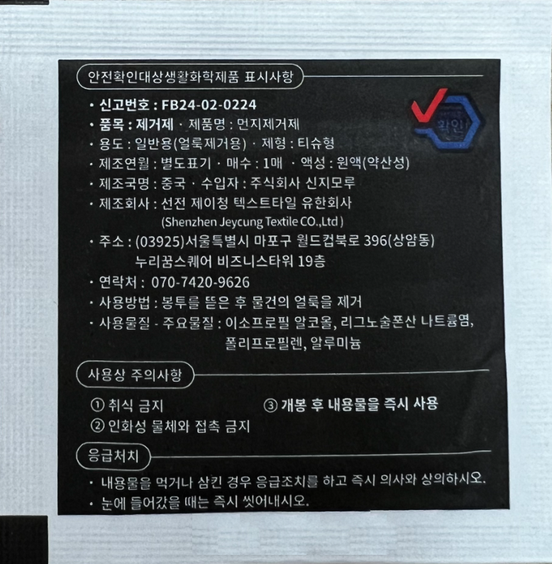 | 품명 및 모델명 | 신지모루 태블릿 액정보호필름 | 인증/허가 사항 | 본품:해당없음/알콜솜: FB24-02-0224 |
