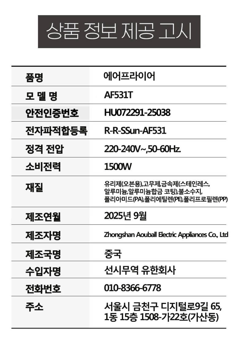 | 품명 및 모델명 | 품명:에어프라이어;모델:AF531T | KC 인증정보 | 안전인증서:HU072291-25038 / R-R-SSun-AF531 |