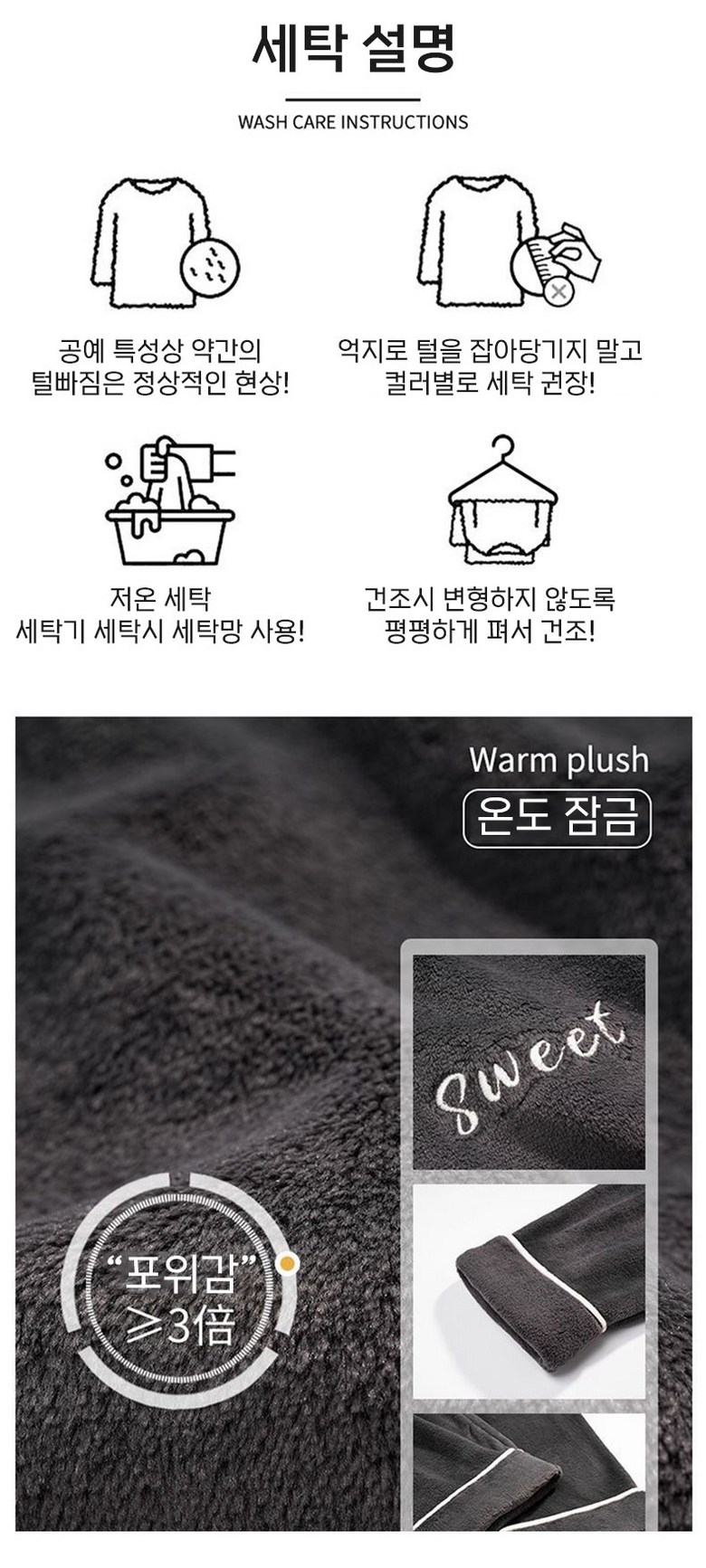 | 제조국 | 중국OEM | 세탁방법 및 취급시 주의사항 | 중성세제로 약하게 단독 손세탁 or 드라이크리닝 권장 |