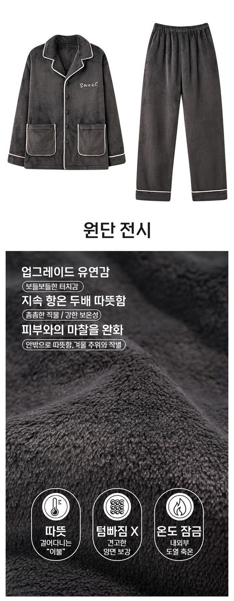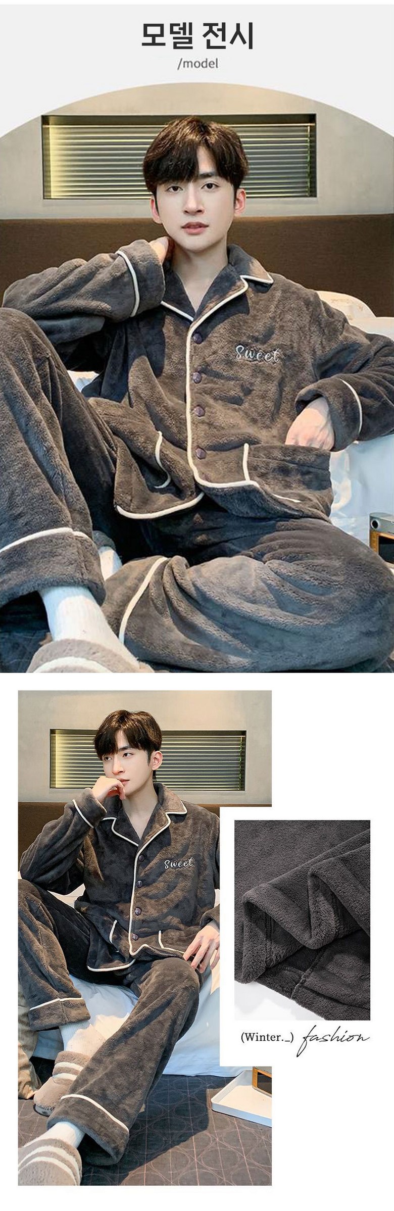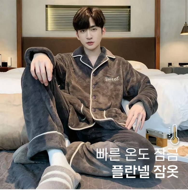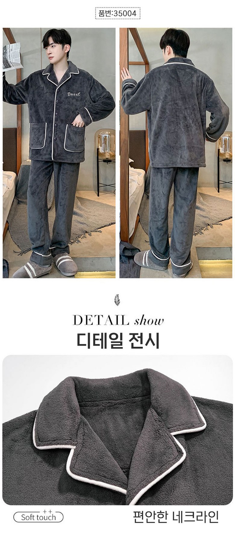 | 제품 소재 | 남성용 피치기모 긴팔 카라 잠옷 상하의 세트 | 색상 | 블랙,멜란지 그레이 |