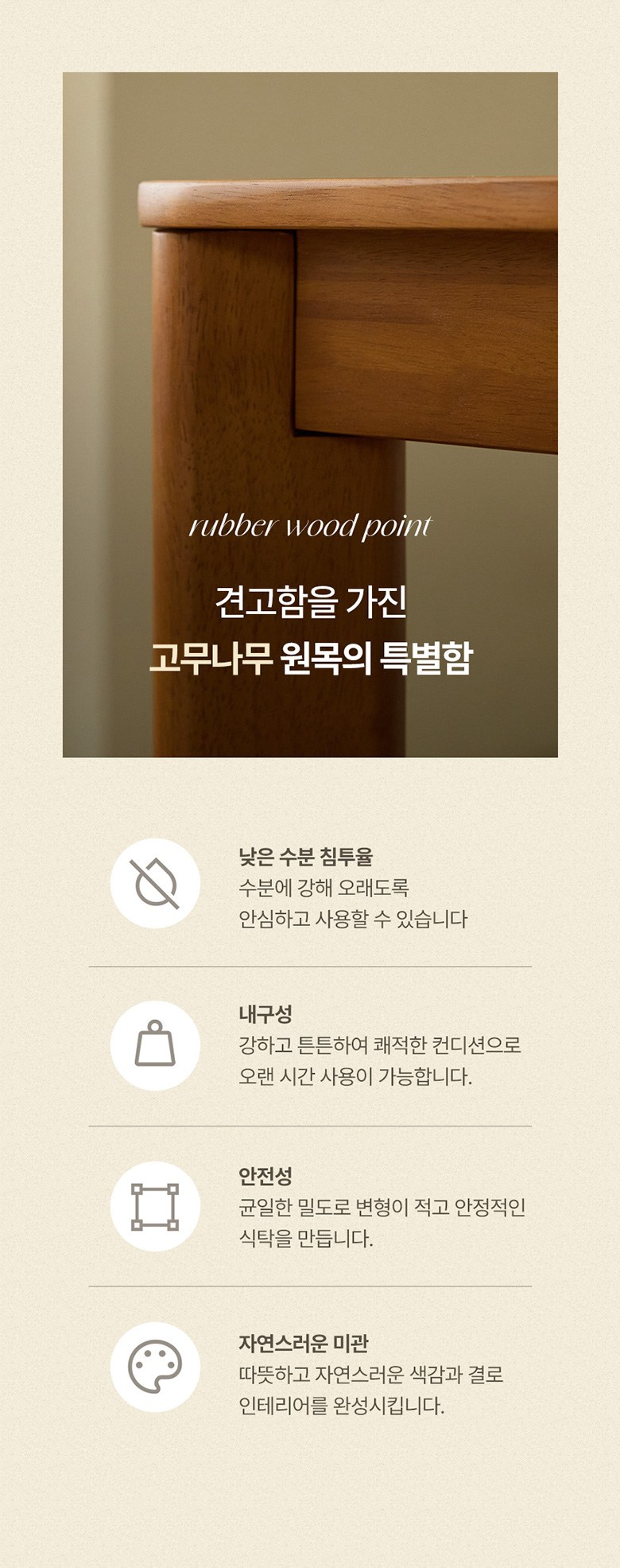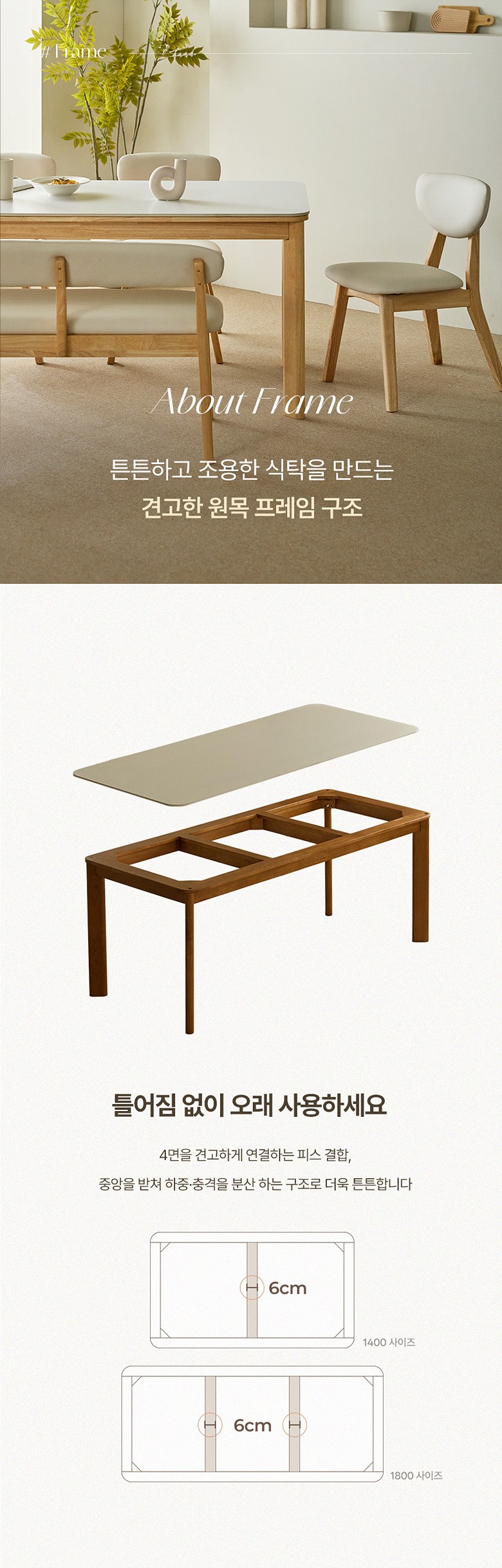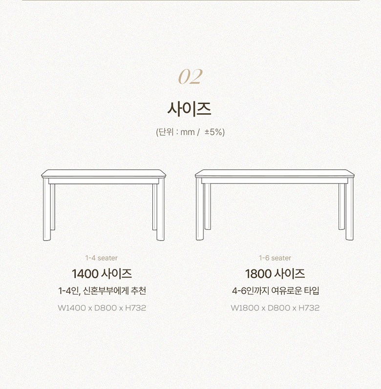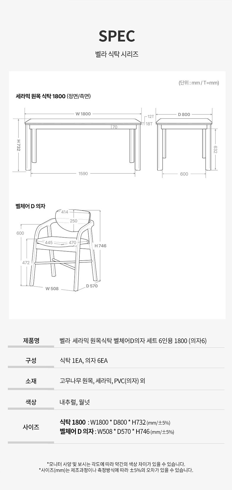 - 사이즈: 식탁(1800 x 800 x 732 mm), 의자(508 x 570 x 746 mm)