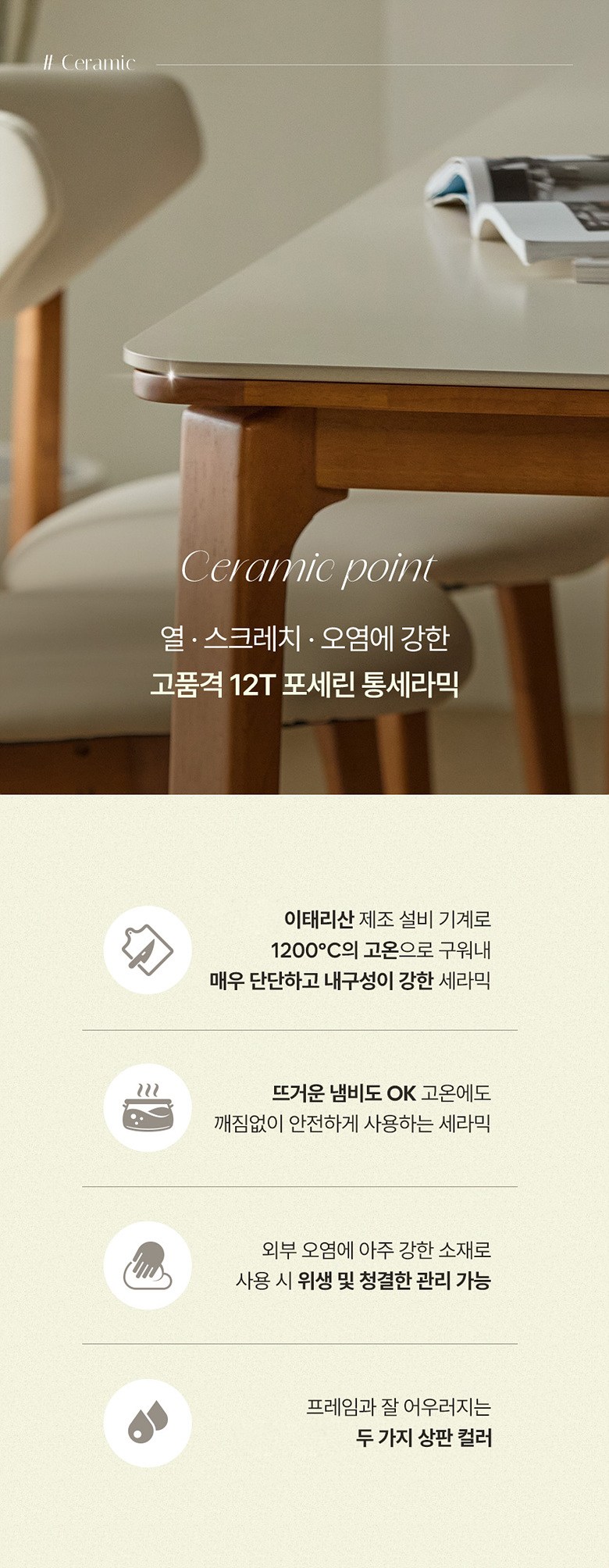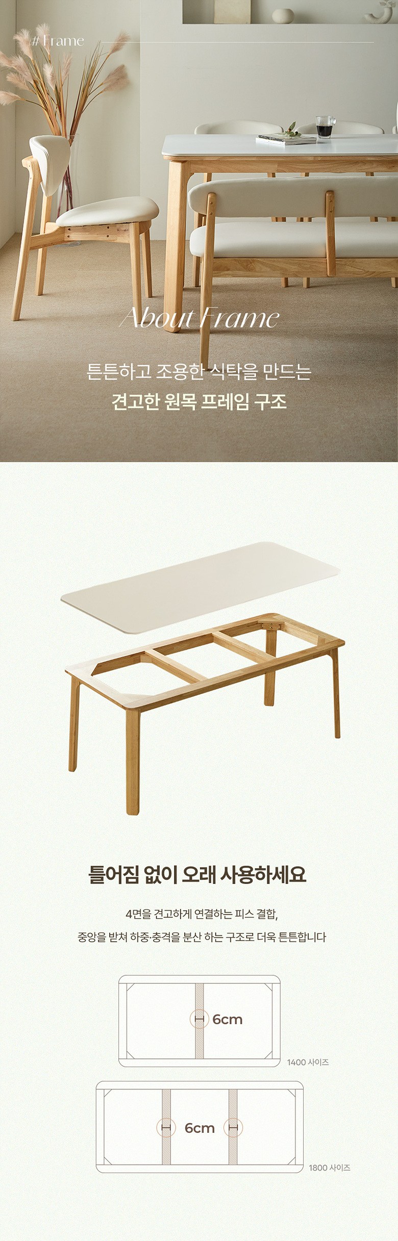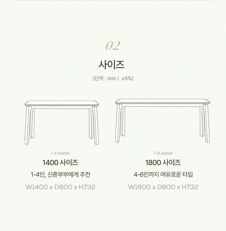 - 사이즈: 식탁(1800 x 800 x 732 mm), 의자(494 x 546 x 766 mm)