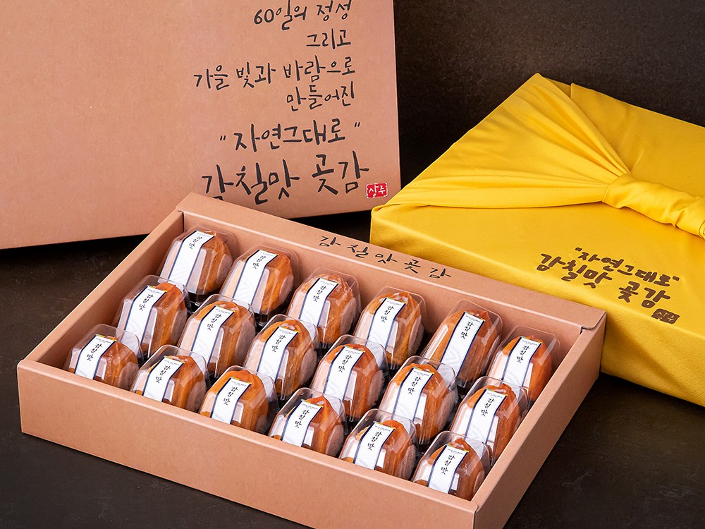 영롱한 주황빛을 자아내는 곶감이랍니다. 통통하고 쫀득해서 베어 무는 식감이 훌륭하지요. 입안 가득 깔끔하고 정갈한 단맛이 퍼진답니다. 향긋한 차와 함께 즐기기 좋은 디저트예요. 특별한 마음을 전하기 좋답니다.