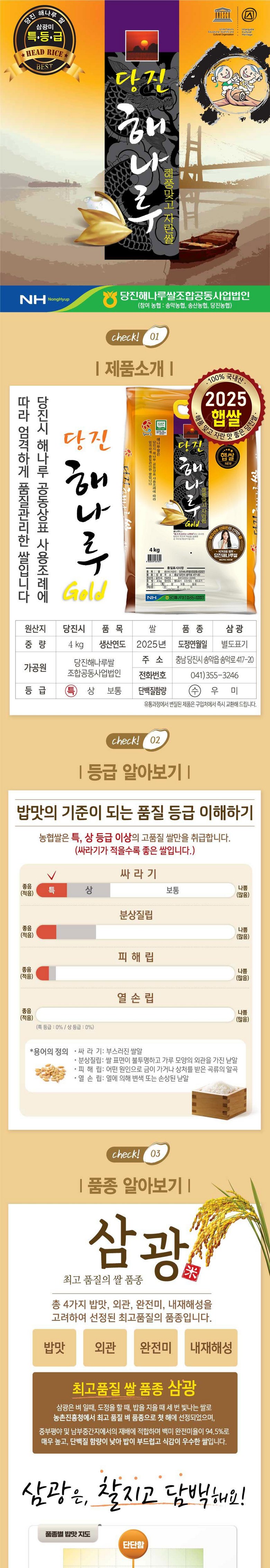 | 제조연월일, 소비기한 또는 품질유지기한 | 생산년도: 2025년산// 제조연월일: 별도표기 ( 출고당일도정)// 유통기한: 신선식품으로 별도의 유통기한이 없어 품질유지기한 기재가 어렵습니다. | 세부 품목군별 표시사항 | <농산물>1) 유전자 변형농산물 표시 - 해당없음2) 지리적표시 - 충남 당진시 |