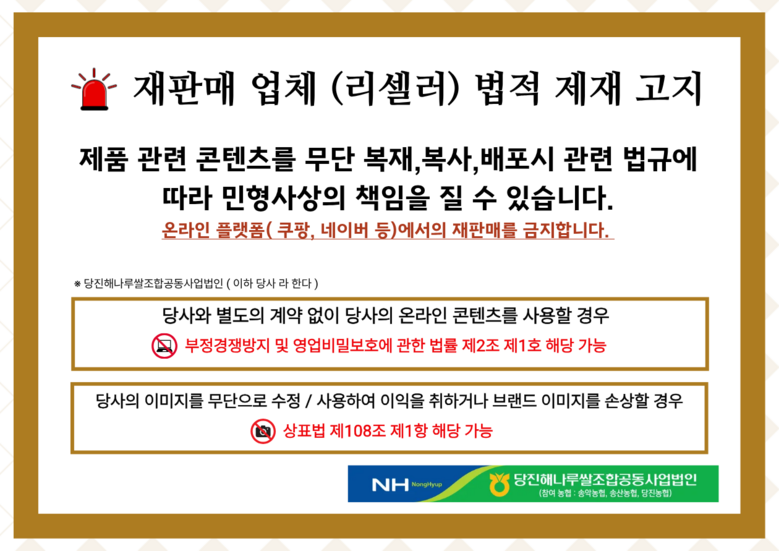 상호/대표자 | 당진해나루쌀조합공동사업법인 / 박승석 | 사업장 소재지 | 충청남도 당진시 송악읍 송악로 417-20 당진해나루쌀조합공동사업법인 |