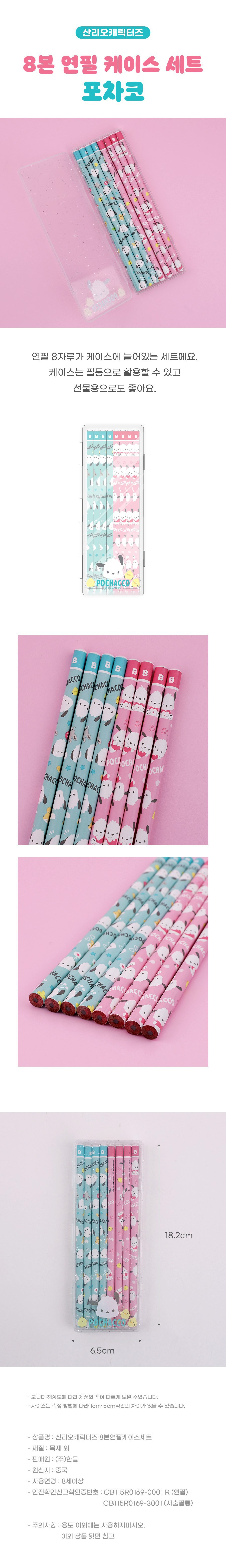 | 품명 및 모델명 | 산리오캐릭터즈_8본연필케이스세트_포차코 | KC 인증정보 | 연필: CB115R0169-0001r / 사출필통: CB115R0169-3001 |