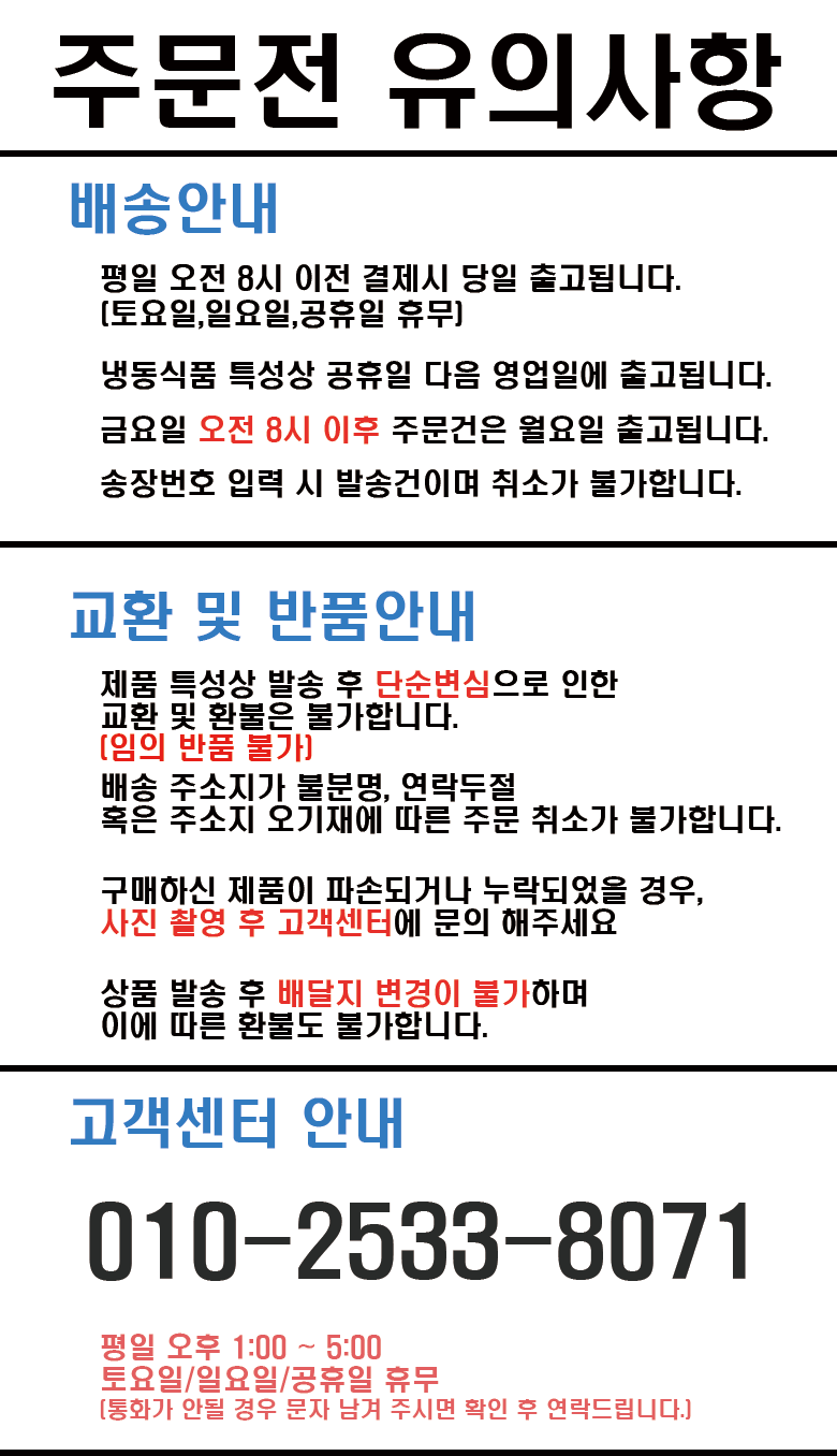 - ㆍ모니터 해상도의 차이로 인해 색상이나 이미지가 실제와 달라, 고객이 단순 변심으로 교환/반품을 무료로 요청하는 경우