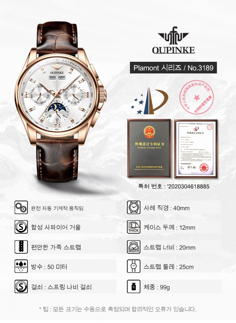 | 치수 | 케이스 직경: 40MM케이스 두께:12MM체인 너비:20MM체인 길이:25MM | 착용 시 주의사항 | 1.시계는 단단한 물체와의 충격이나 마찰을 피해주세요. 케이스 및 유리 표면에 스크래치가 발생할 수 있습니다.2.향수, 화장품, 세제 등 화학제품과의 직접 접촉을 피해주세요. 밴드 및 케이스 변색·부식의 원인이 됩니다.3.사우나, 온천, 뜨거운 물 목욕 등 고온·다습한 환경에서 착용은 삼가해주세요. 시계의 방수 및 밀폐 성능에 영향을 줄 수 있습니다.4.방수 등급은 생활방수 기준이며, 수영·잠수 등 물놀이 시 착용은 권장하지 않습니다. (특별히 방수 모델로 표기된 경우 제외)5.가죽 밴드는 물과 장기간 접촉 시 경화, 갈라짐, 냄새 발생 등이 생길 수 있으므로 주의해주세요.6.자동 기계식 시계는 장시간 미착용 시 멈출 수 있으므로, 일정 주기로 수동 감기를 해주세요. |