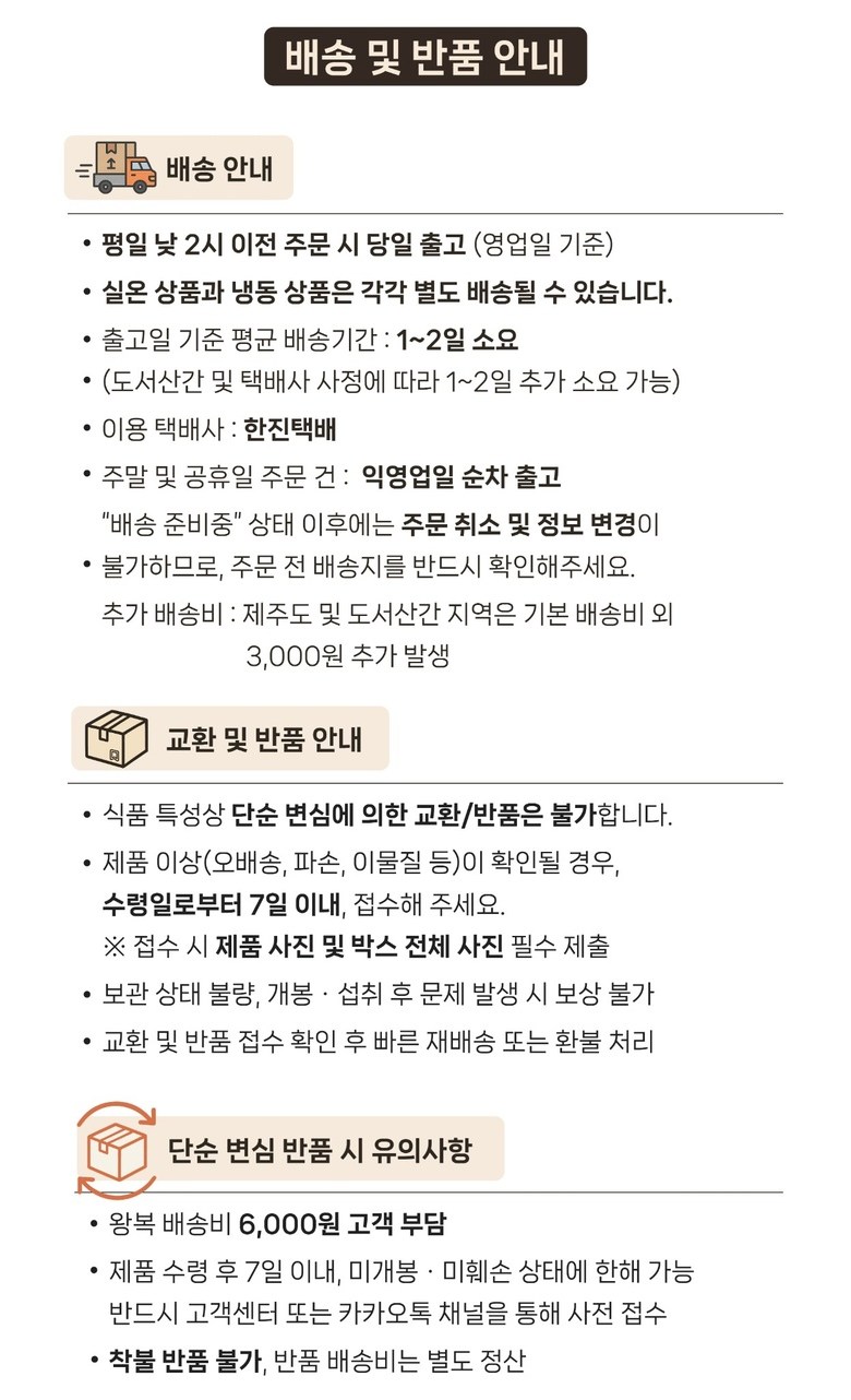 | 교환/반품 비용 (왕복비용) | 6,000원 - 단, 고객 변심의 경우에만 발생 - 도서산간 지역 배송불가 |
