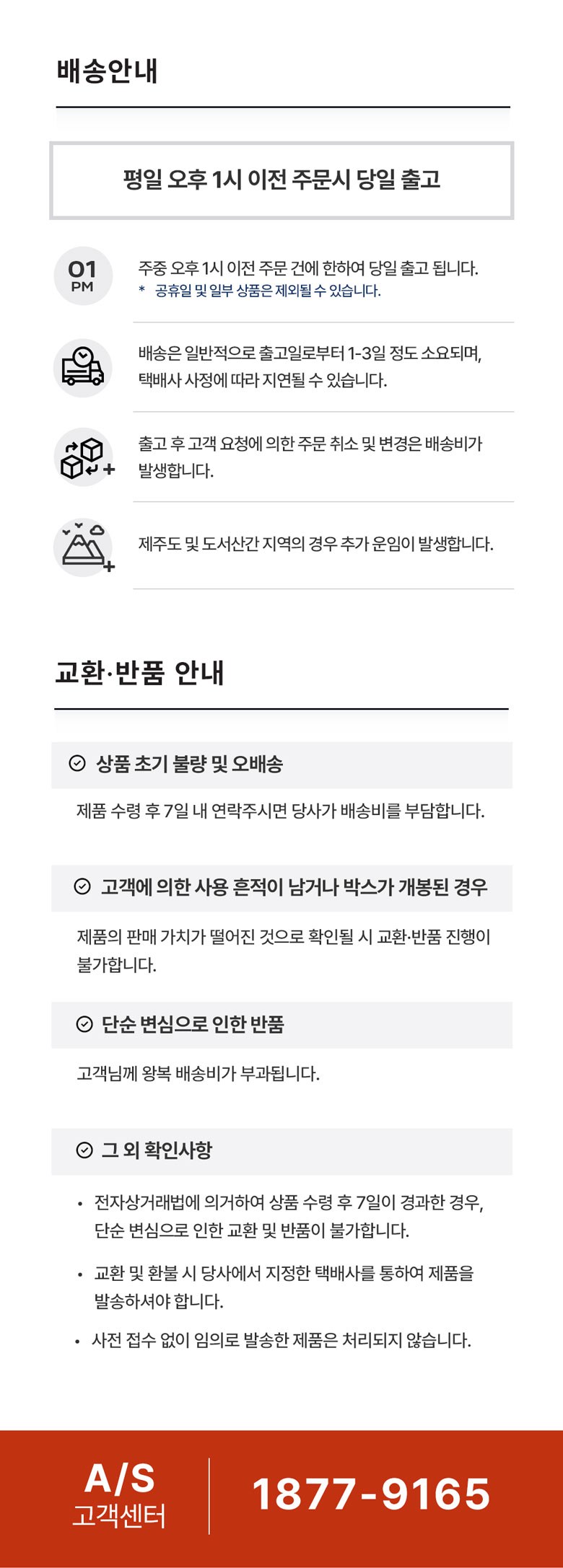 - ㆍ모니터 해상도의 차이로 인해 색상이나 이미지가 실제와 달라, 고객이 단순 변심으로 교환/반품을 무료로 요청하는 경우