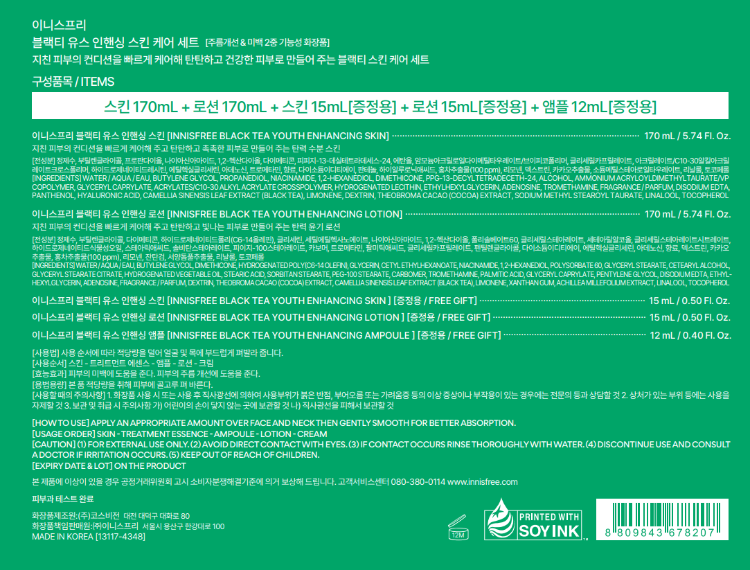 - 구성품: 스킨 170ml + 15ml + 로션 170ml + 15ml + 앰플 12ml
