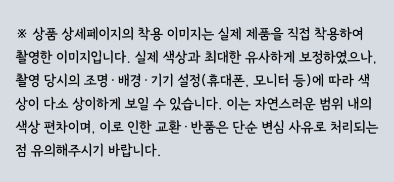 - ㆍ모니터 해상도의 차이로 인해 색상이나 이미지가 실제와 달라, 고객이 단순 변심으로 교환/반품을 무료로 요청하는 경우