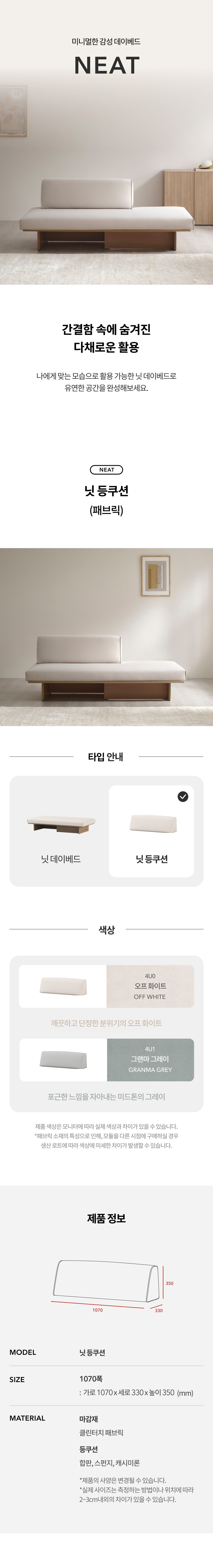 - 사이즈: 소파(1840 x 920 x 388 mm), 등쿠션(1070 x 330 x 350 mm)