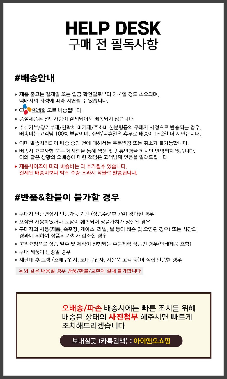 - ㆍ모니터 해상도의 차이로 인해 색상이나 이미지가 실제와 달라, 고객이 단순 변심으로 교환/반품을 무료로 요청하는 경우