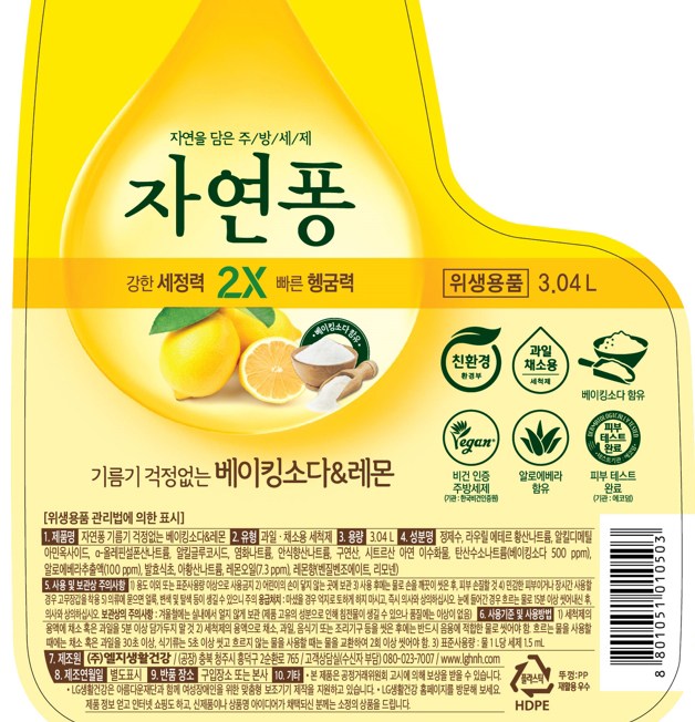 | 품명 및 모델명 | 자연퐁 기름기 걱정없는 베이킹소다 & 레몬 | 인증/허가 사항 | 위생용품 |