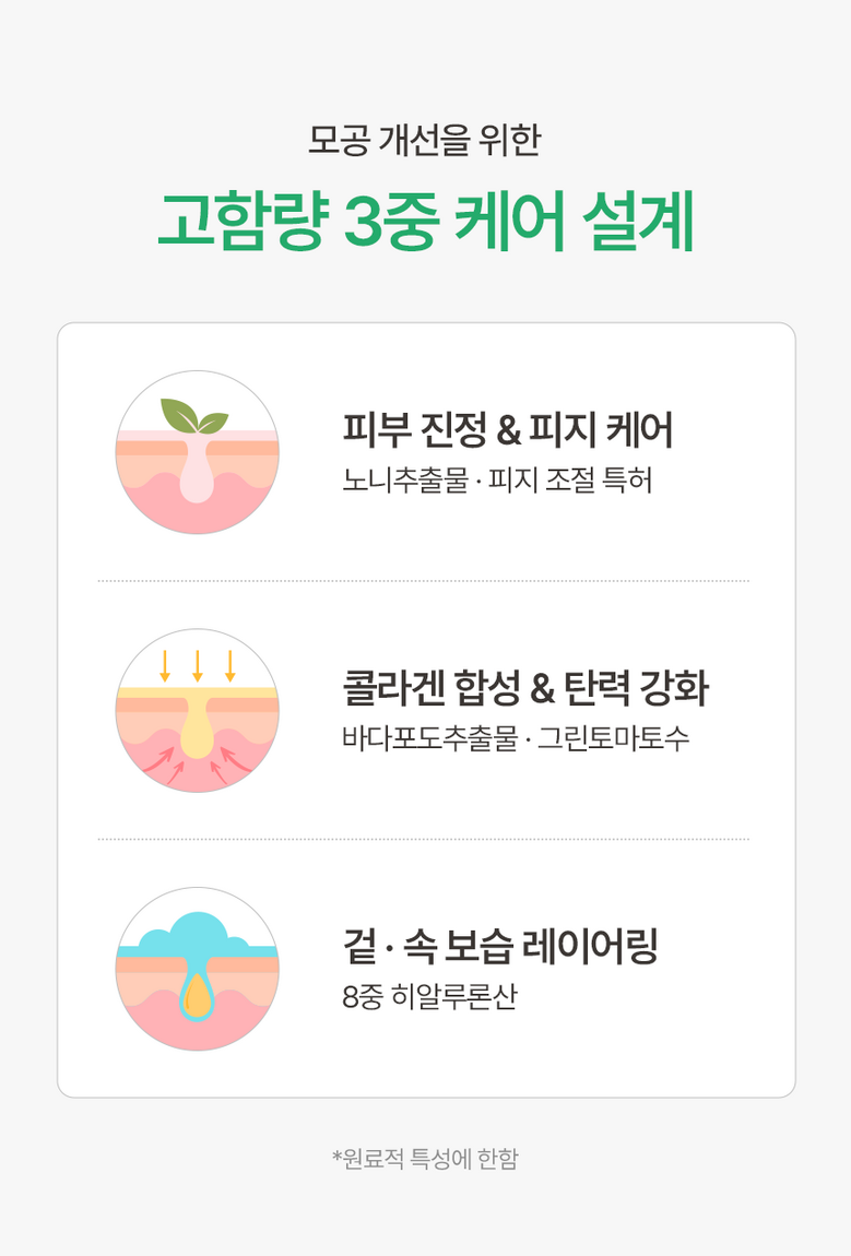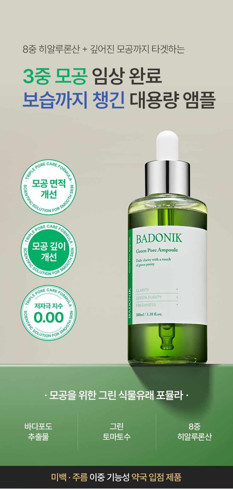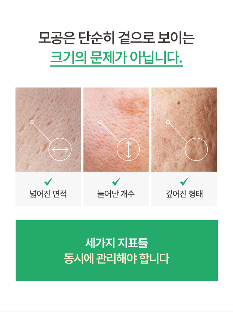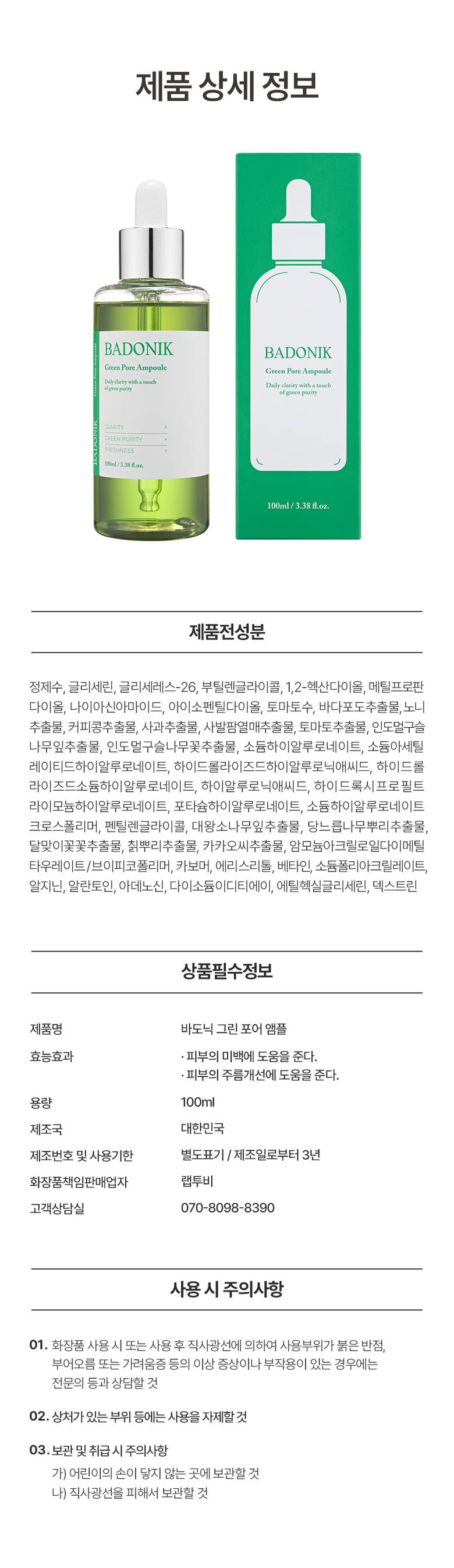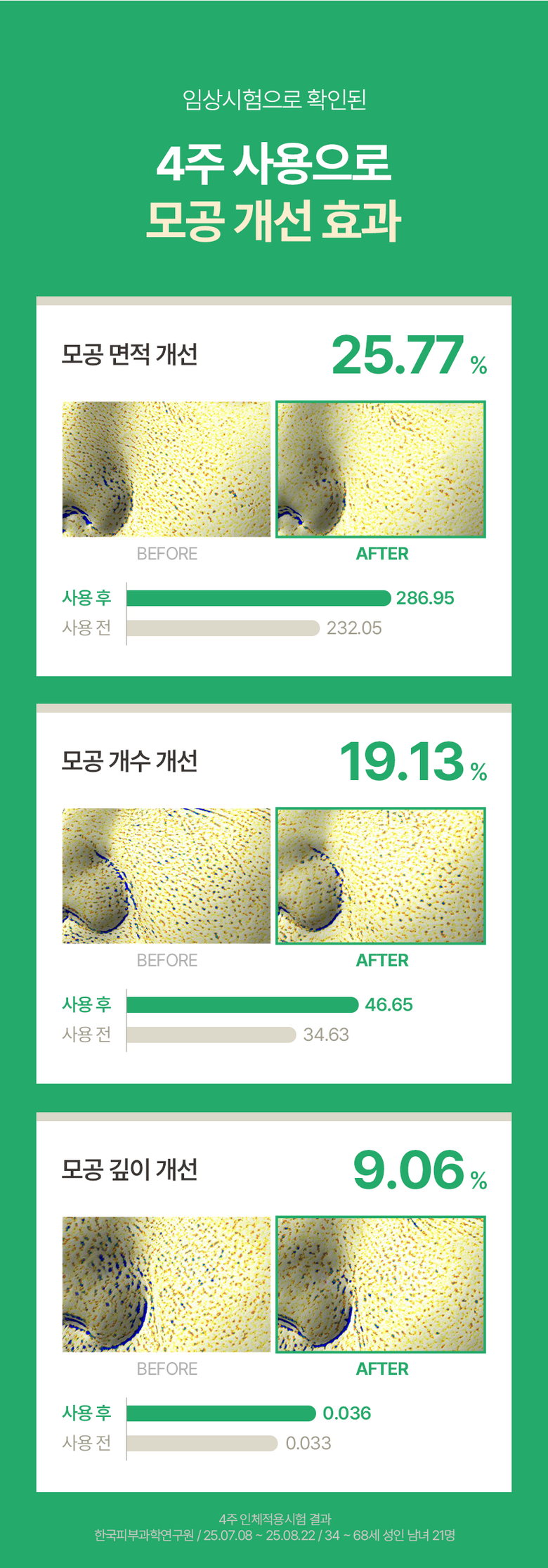 | 용량(중량) | 100ml / 3.38 fl.oz. | 제품 주요 사양 | 모든피부용 / 모공 3중 임상 완료 / 저자극 지수 0.00 임상 완료 |