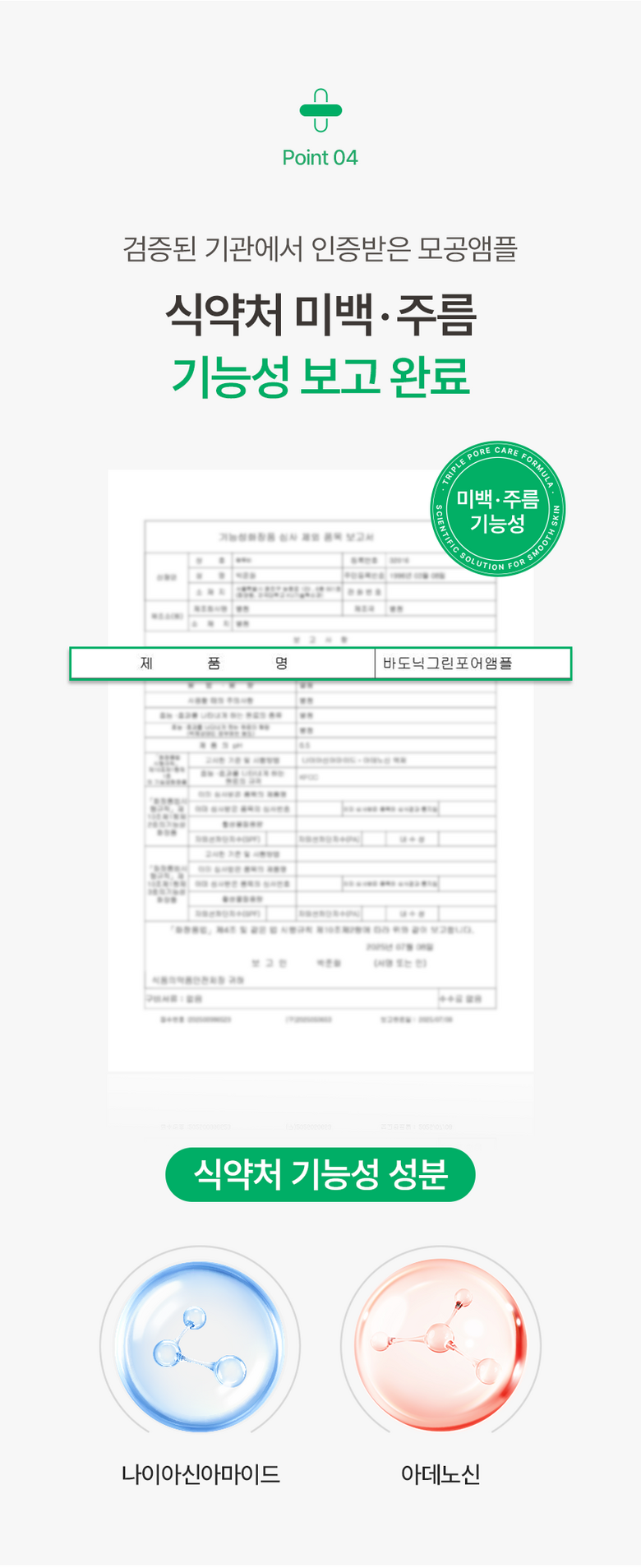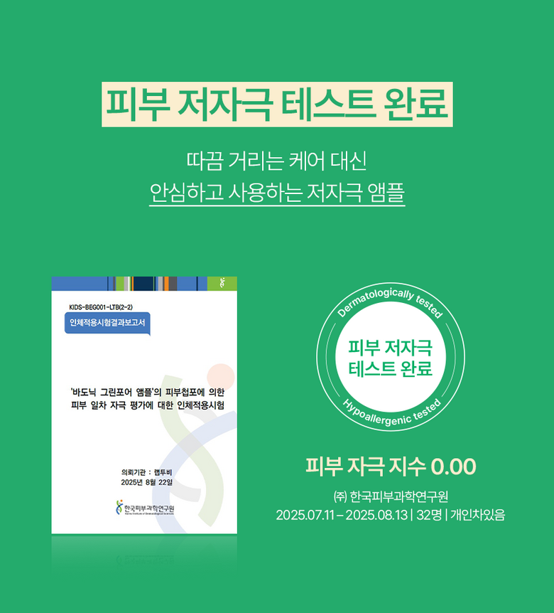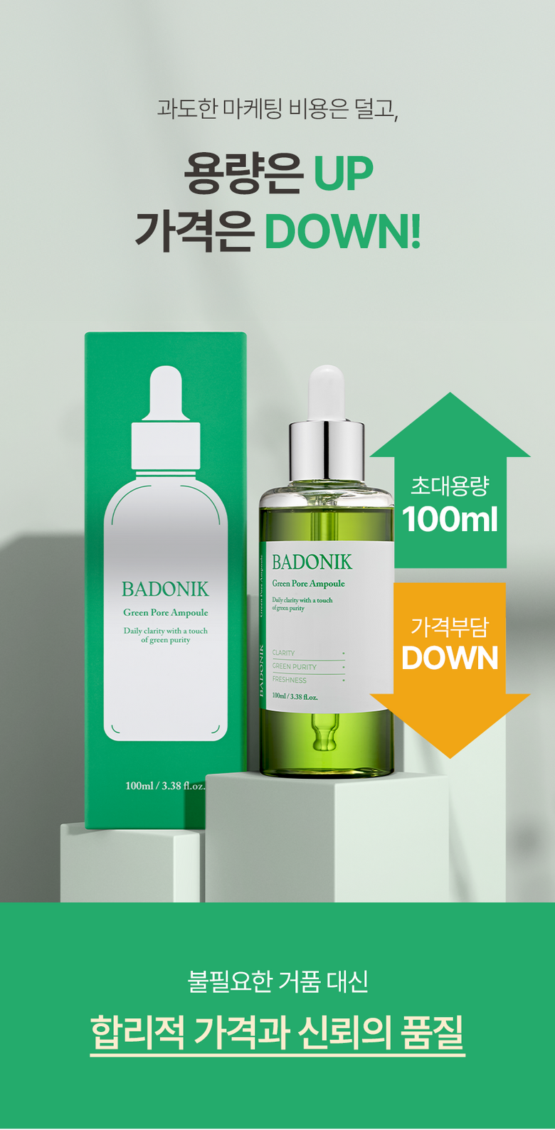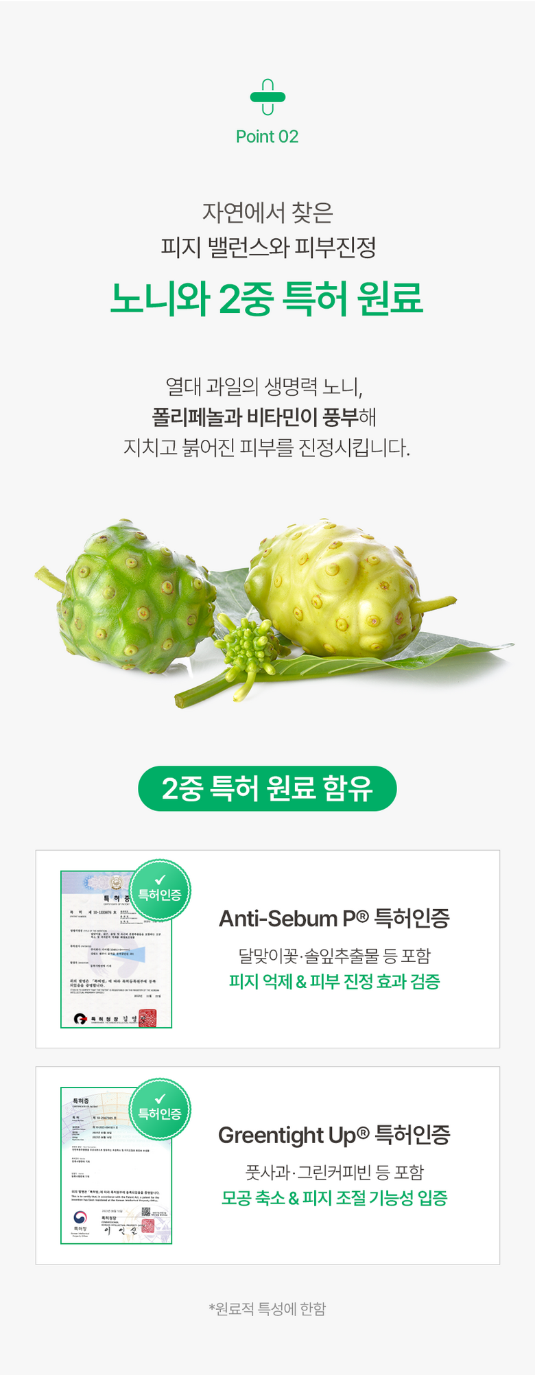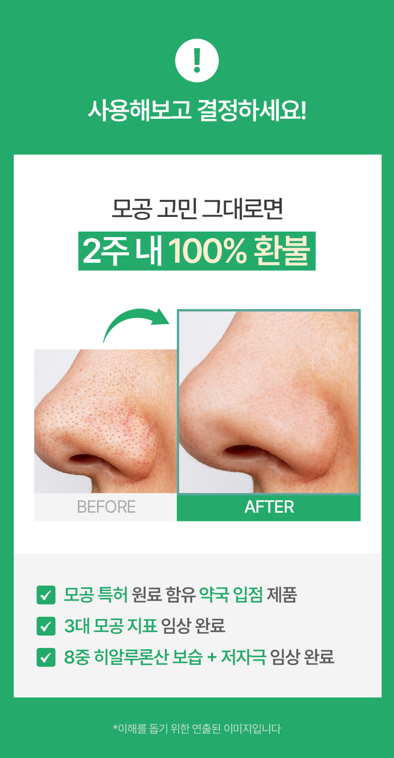 | 용량(중량) | 100ml / 3.38 fl.oz. | 제품 주요 사양 | 모든피부용 / 모공 3중 임상 완료 / 저자극 지수 0.00 임상 완료 |
