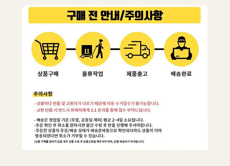 - ㆍ교환/반품에 관한 일반적인 사항은 판매자가 제시사항보다 관계법령이 우선합니다.