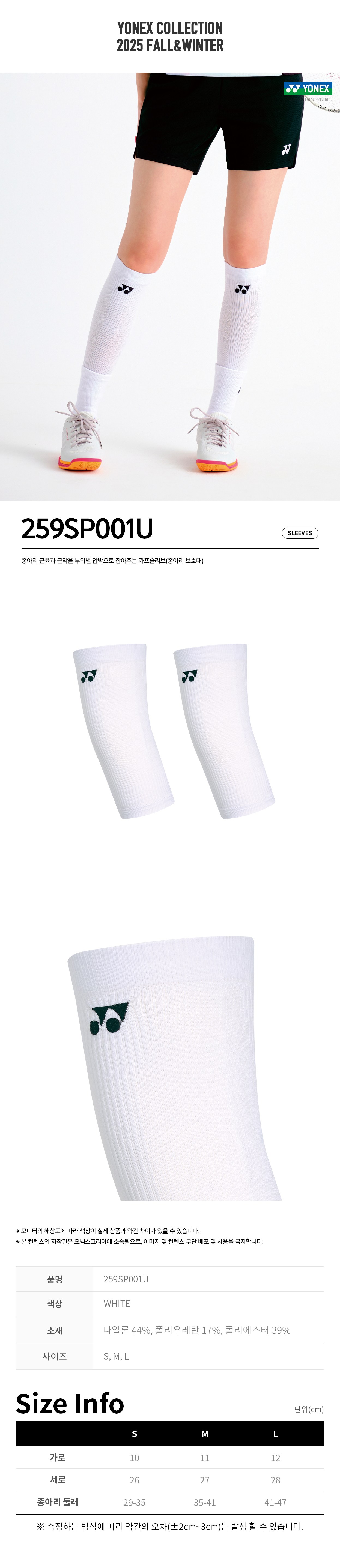 | 품명 및 모델명 | 요넥스 니슬리프 (종아리 보호대) 배드민턴 보호대 (양쪽1세트) 259SP001U WHITE 1세트 M | KC 인증정보 | 해당없음 |
