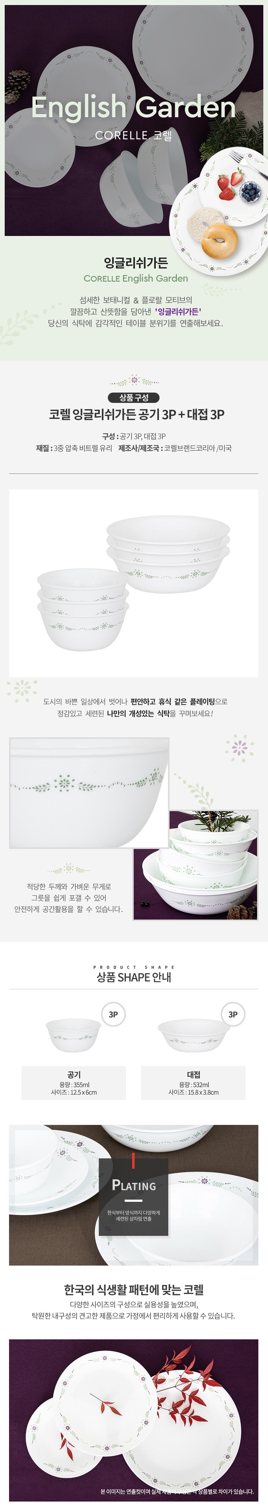 | 품명 및 모델명 | 코렐 잉글리쉬가든 공기3p+대접3p | 재질 | 컨텐츠참조 |