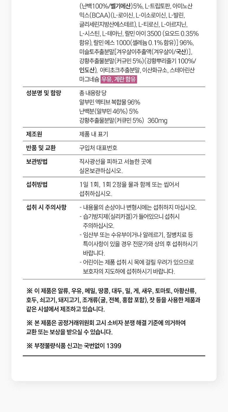 | 포장단위별 내용물의 용량(중량), 수량 | 상품 상세페이지 참조 | 원재료명 및 함량 | 상품 상세페이지 참조 |