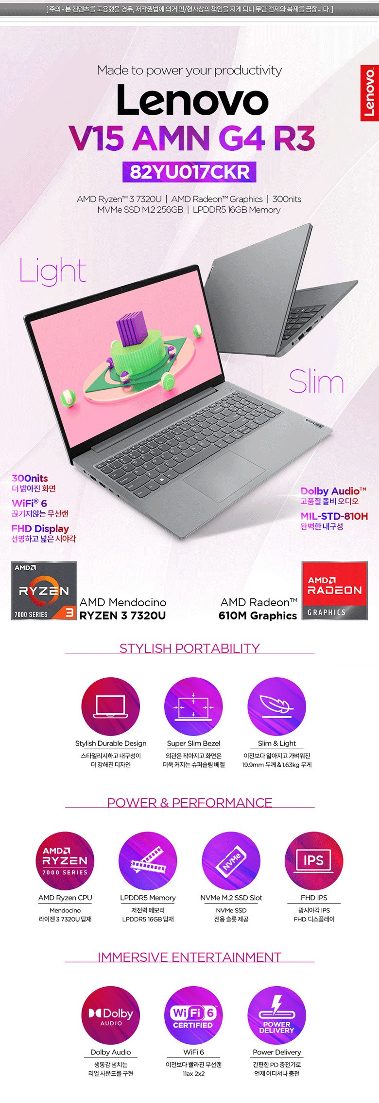 | 품명 및 모델명 | 노트북 / V15 AMN G4 R3(Lenovo V15 G4 AMN) | KC 인증정보 | 본품: XU102330-23114A, R-R-LVK-V15-82YU / 특정소출력 무선기기: R-C-MD6-MT7921 |