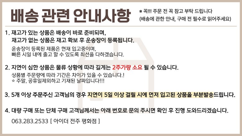 | 배송기간 | ㆍ도서산간 지역 등은 배송에 3-5일이 더 소요될 수 있습니다. - 천재지변, 물량 수급 변동 등 예외적인 사유 발생 시, 다소 지연될 수 있는 점 양해 부탁드립니다. | ||