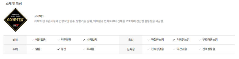 - GORE-TEX 2레이어 원단의 특장점 견고한 방수성 (Durably Waterproof) GUARANTEED TO KEEP YOU DRY™ 품질보증 시스템으로 뛰어난 방수성을 보장합니다. 어떤 열정적 활동에도 쾌적함과 편안함을 제공합니다. 뛰어난 투습성 (Reliably Breathable) 땀으로 인한 습기가 쉽게 뱆출되어 더 오래 편안함을 유지합니다. 완벽한 방풍성 (Totally Windproof) 고어텍스 의류는 모든 바람을 차단하여 바람의 한기로부터 체온을 보호합니다.