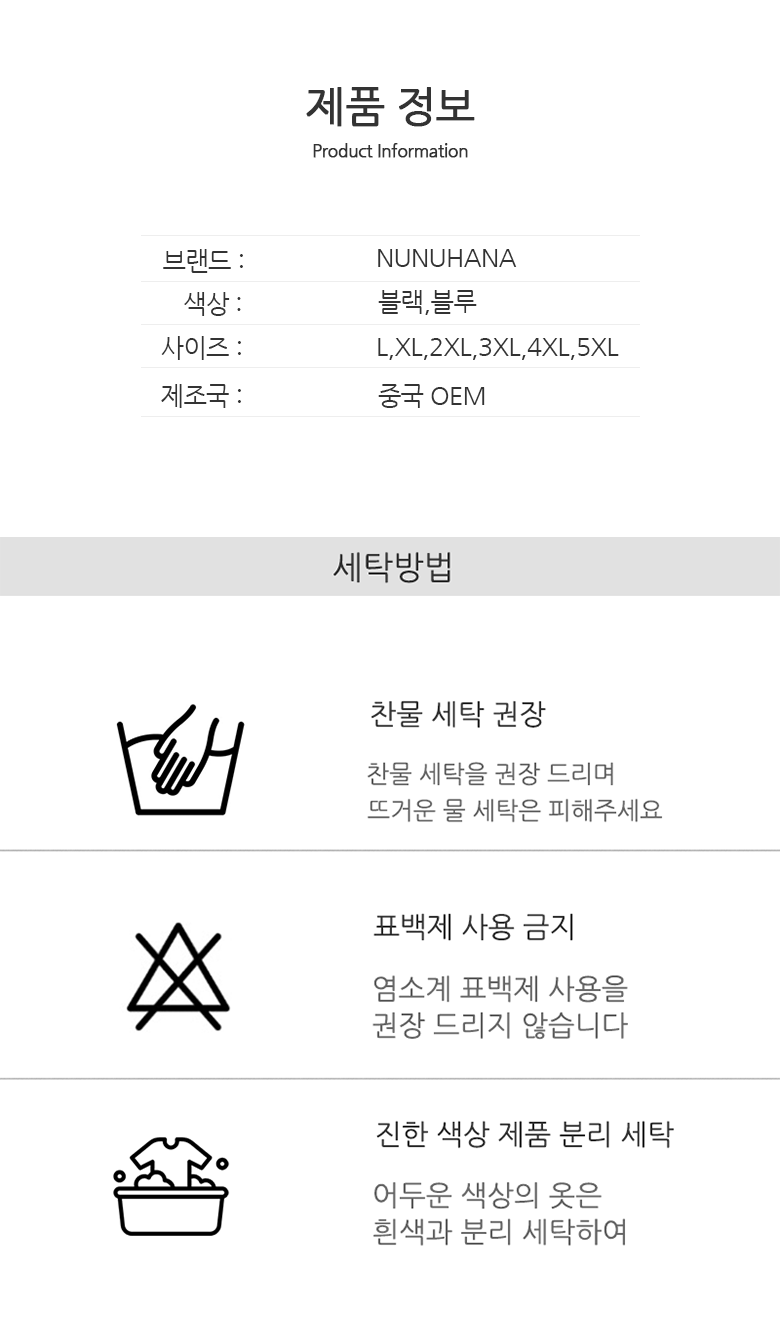| 치수 | L,XL,2XL,3XL,4XL,5XL | 제조자(수입자) | 지성무역 주식회사 |